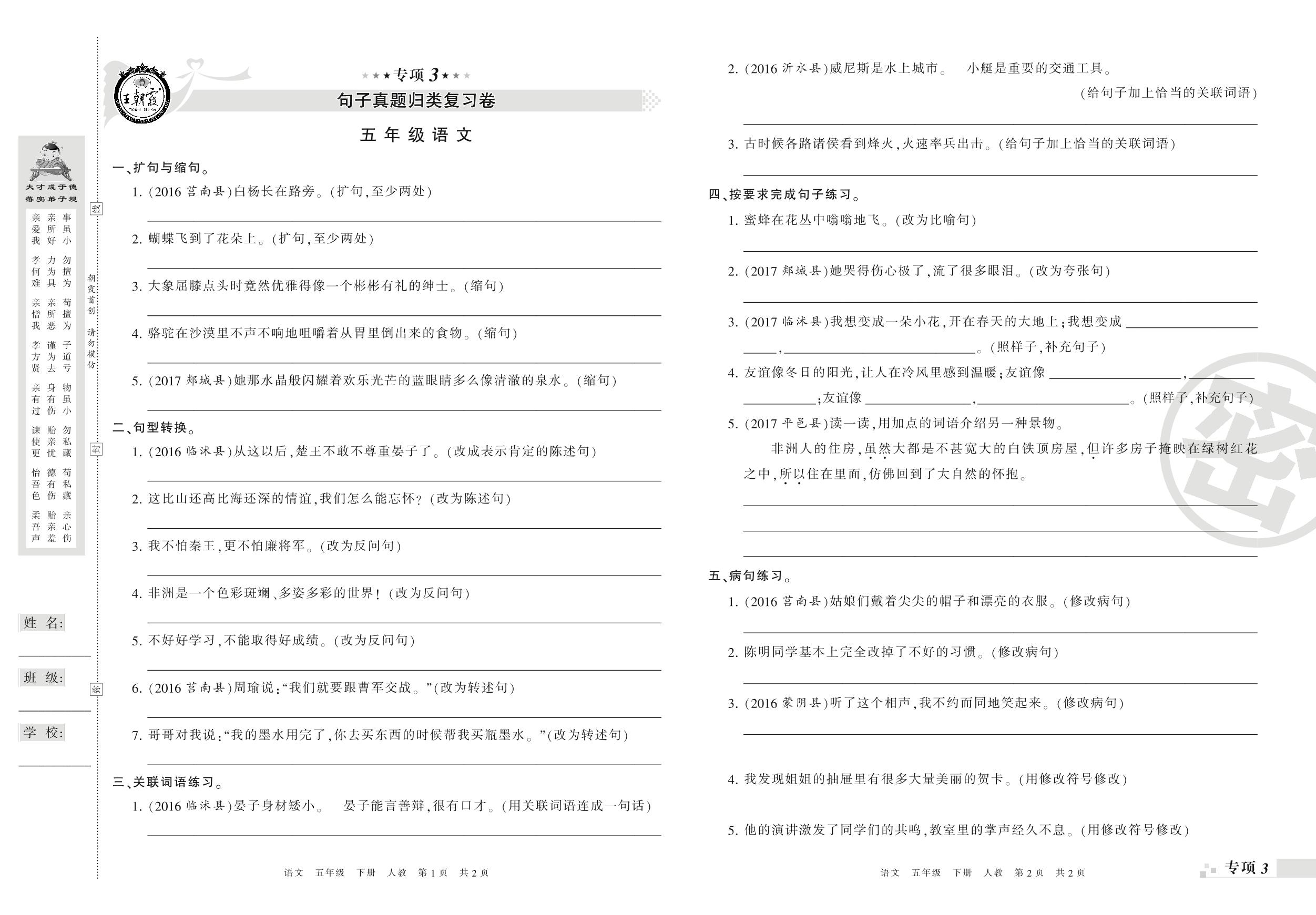 王朝霞期末专项卷——句子、课文内容真题归类复习卷五年级下册语文(人教版)_R210801204744【0】