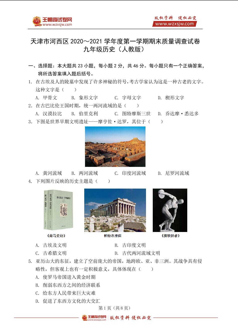 天津市河西区2020~2021学年度第一学期九年级期末质量调查历史试卷(人教版)