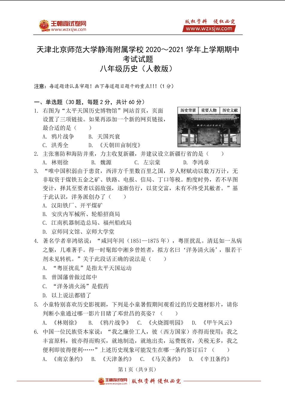 天津北京师范大学静海附属学校2020~2021学年上学期期中考试试题八年级历史(人教版)