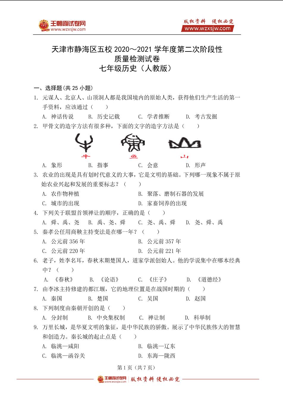 天津市静海区五校2020~2021学年上学期第二次联考试题七年级历史(人教版)