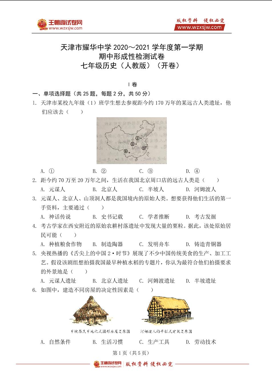 天津市耀华中学2020~2021学年度第一学期期中形成性检测试卷七年级历史(人教版)