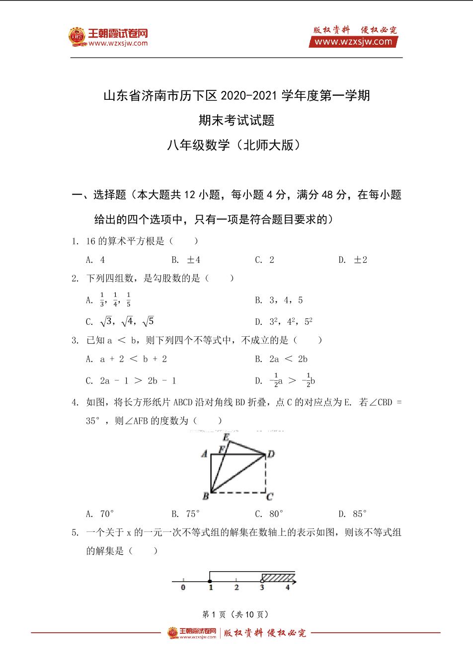 山东省济南市历下区2020-2021学年度第一学期期末考试试题八年级数学(北师大版)