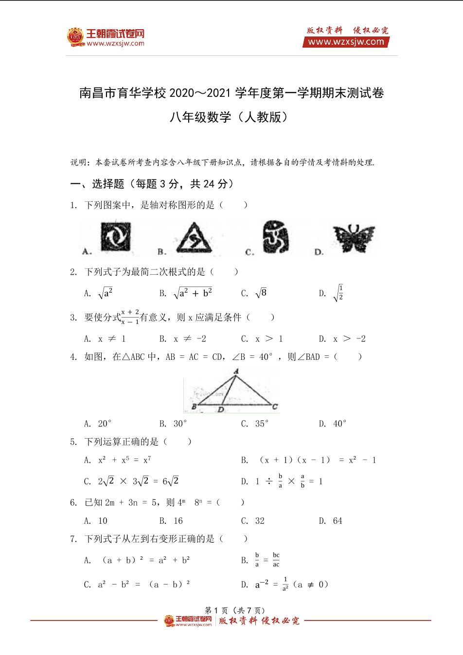 南昌市育华学校2020—2021学年上学期初中八年级期末考试数学试卷(人教版)