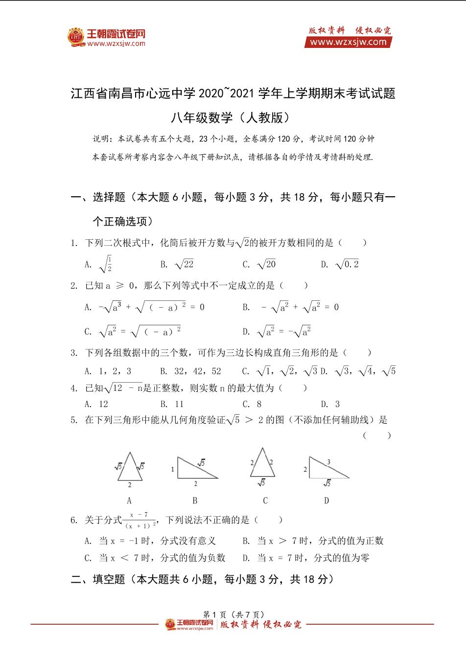 江西省南昌市心远中学2020~2021学年上学期期末考试试题八年级数学(人教版)