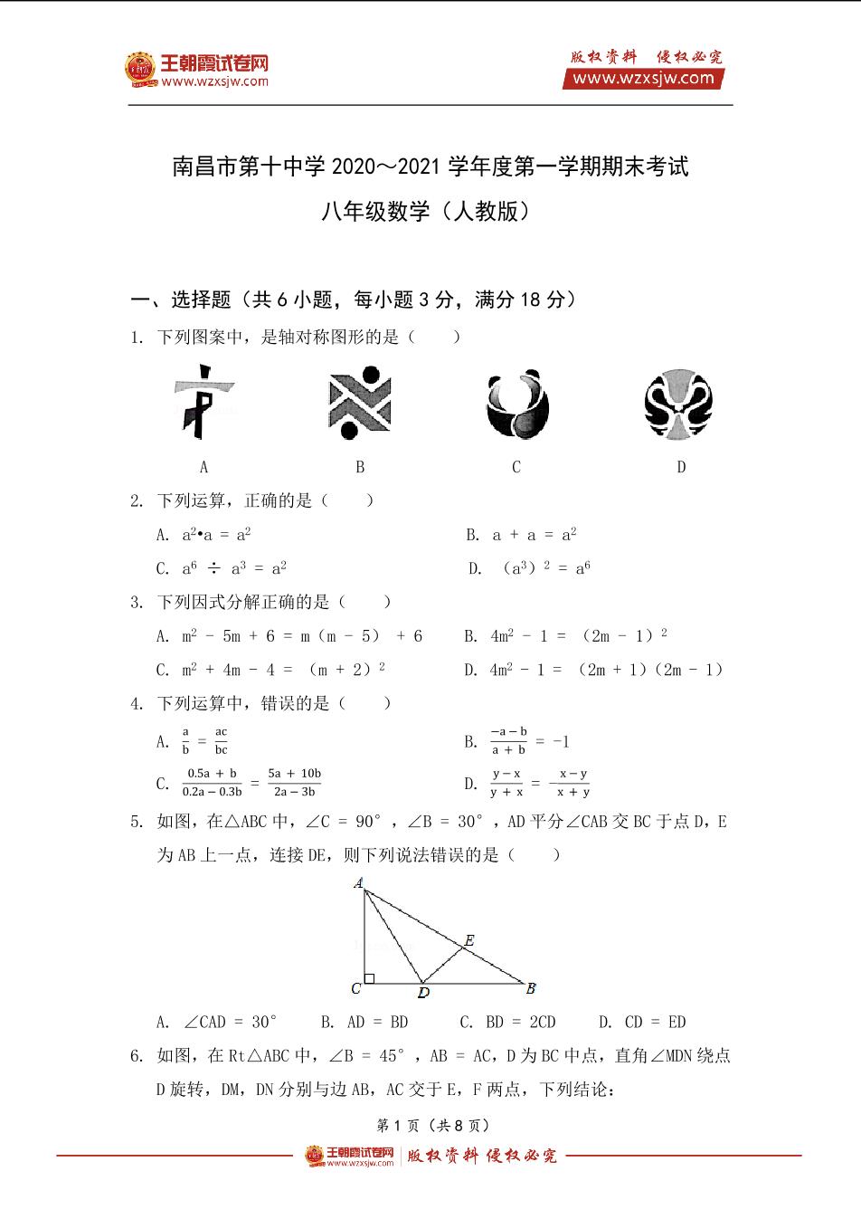南昌市第十中学2020~2021学年度第一学期期末考试八年级数学(人教版)