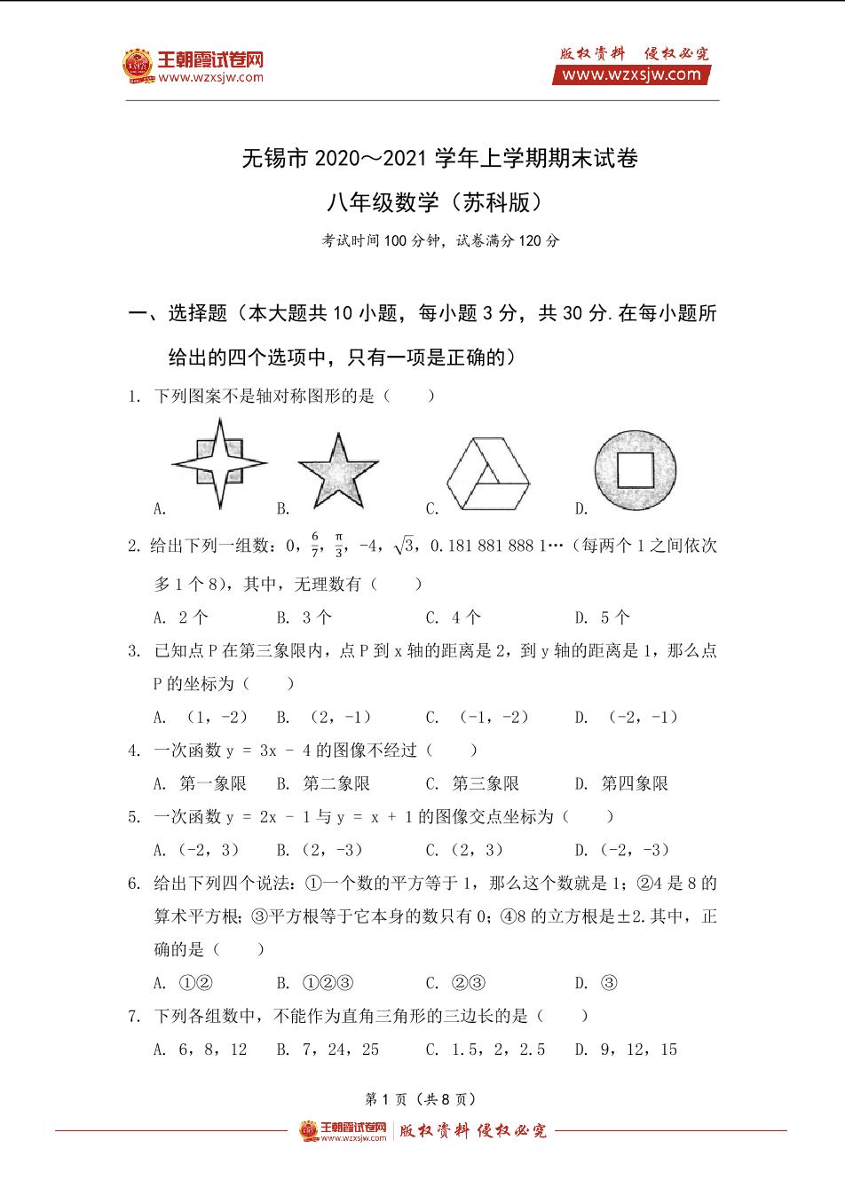无锡市2020~2021学年上学期期末试卷八年级数学(苏科版)