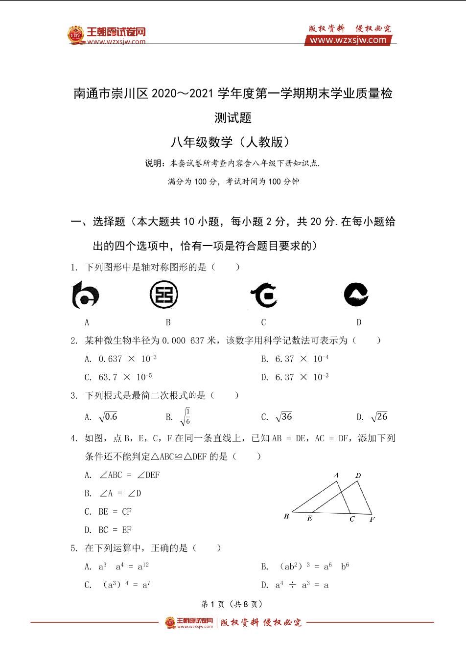 江苏省南通市崇川区2020~2021学年度第一学期期末学业质量检测试题八年级数学(人教版)