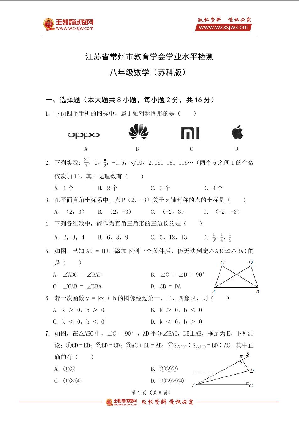 江苏省常州市教育学会学业水平检测八年级数学(苏科版)