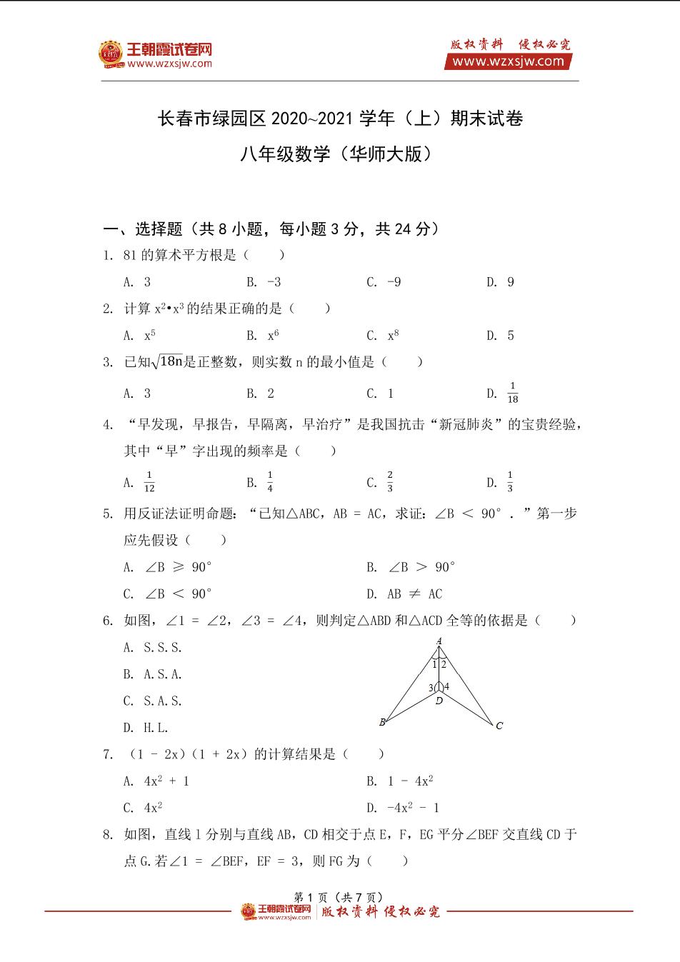 长春市绿园区2020~2021学年(上)期末试卷八年级数学(华师大版)