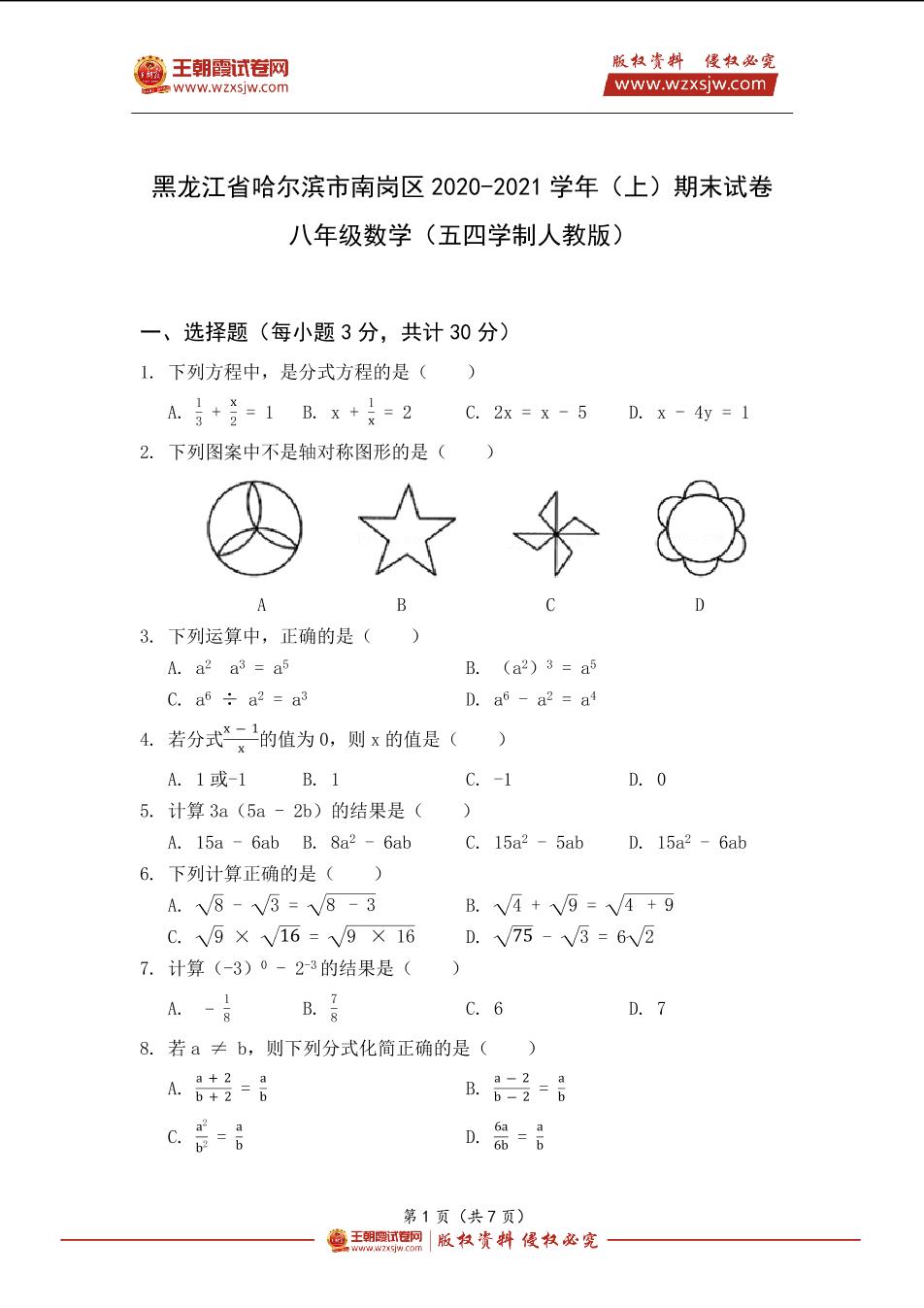 黑龙江省哈尔滨市南岗区2020-2021学年(上)期末试卷八年级数学(五四学制人教版)
