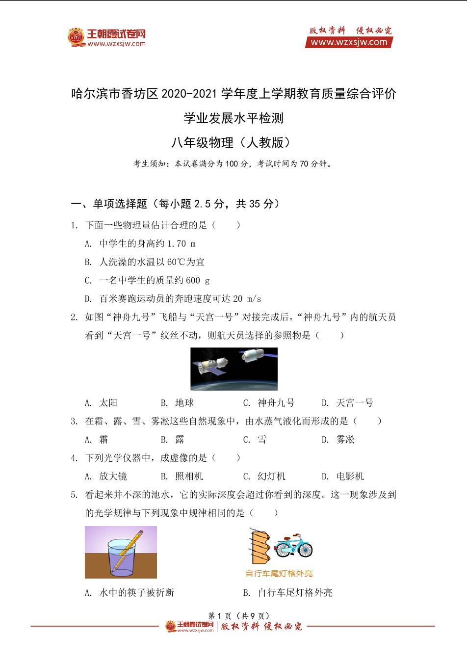 哈尔滨市香坊区2020—2021学年上学期初中八年级期末考试物理试卷(人教版)
