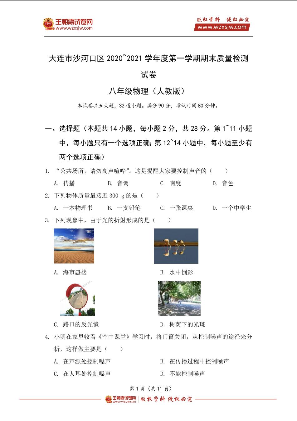 大连市沙河口区2020~2021学年度第一学期期末质量检测试卷八年级物理(人教版)