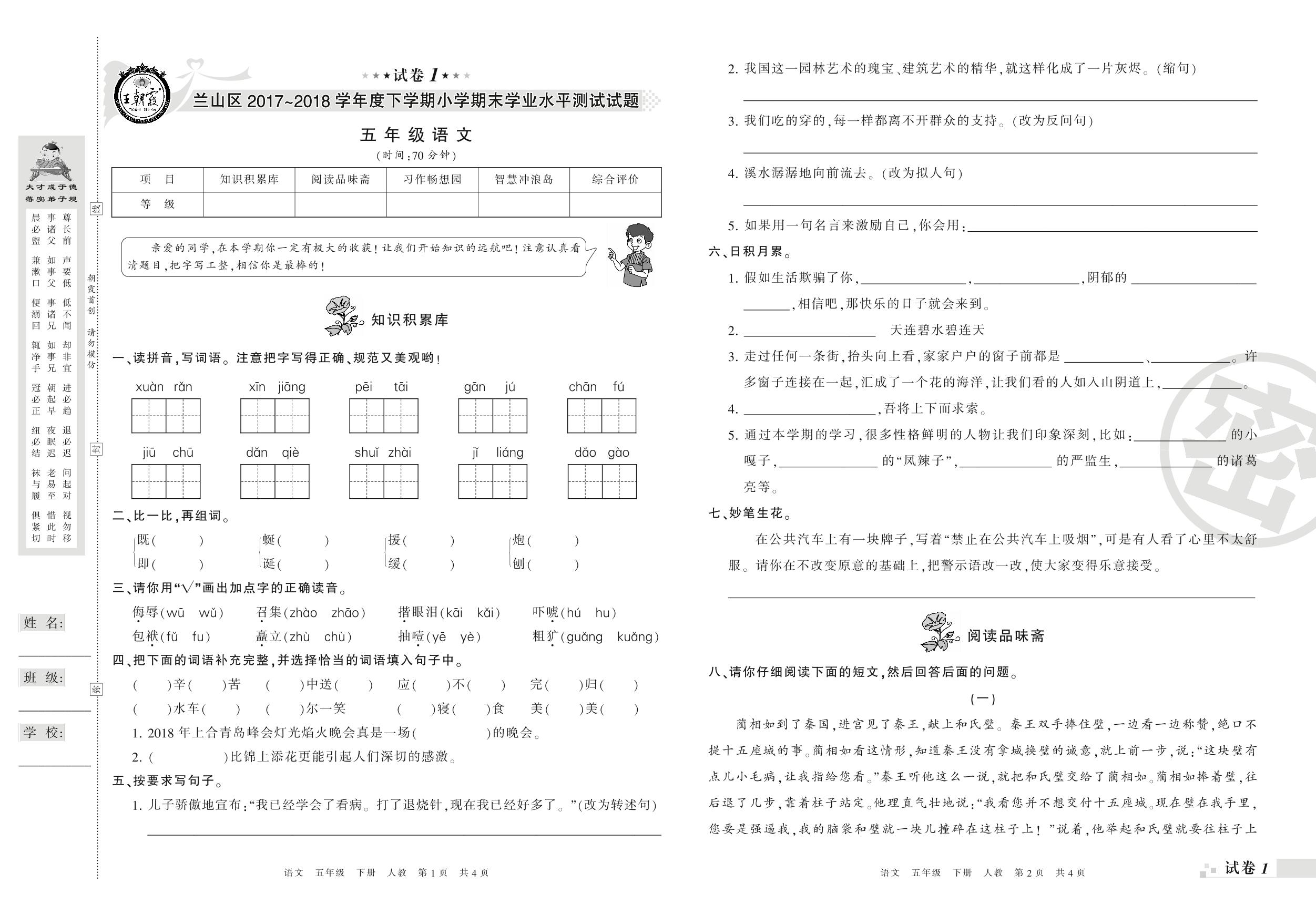 2017-2018学年第二学期临沂市兰山区五年级语文试卷(人教版)【1】
