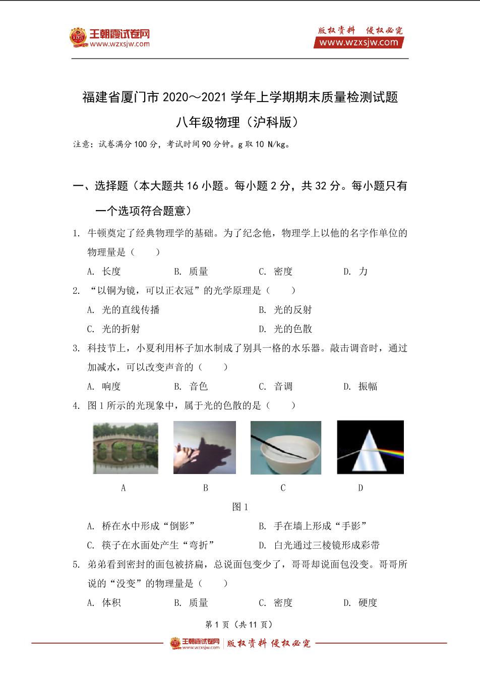 福建省厦门市2020~2021学年上学期期末质量检测试题八年级物理(沪科版)