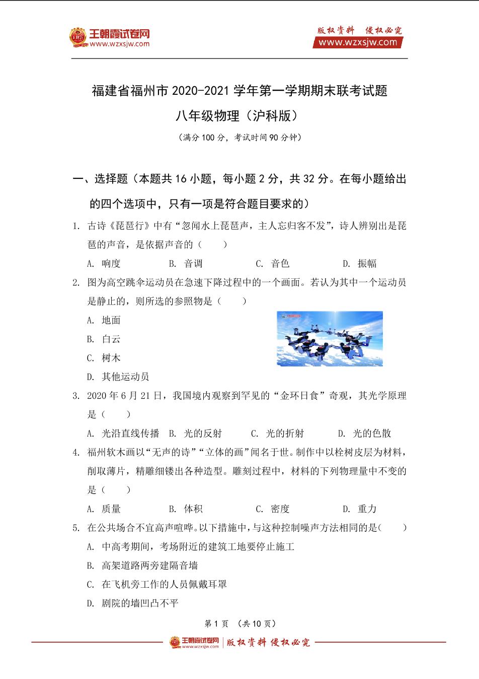 福建省福州市2020-2021学年八年级物理第一学期期末联考试题(沪科版)