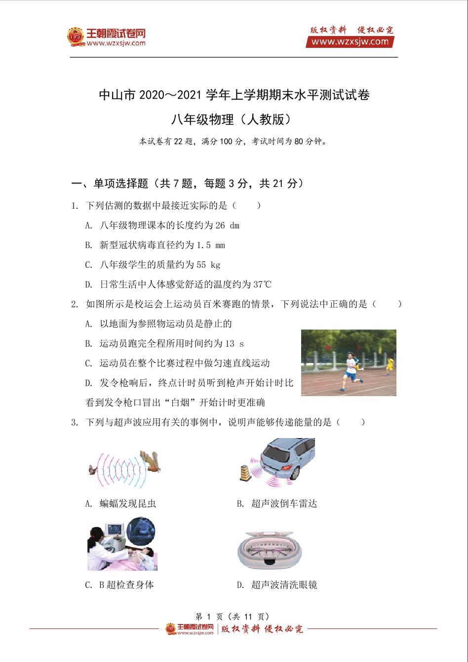 中山市2020-2021学年上学期初中八年级期末考试物理试卷(人教版)