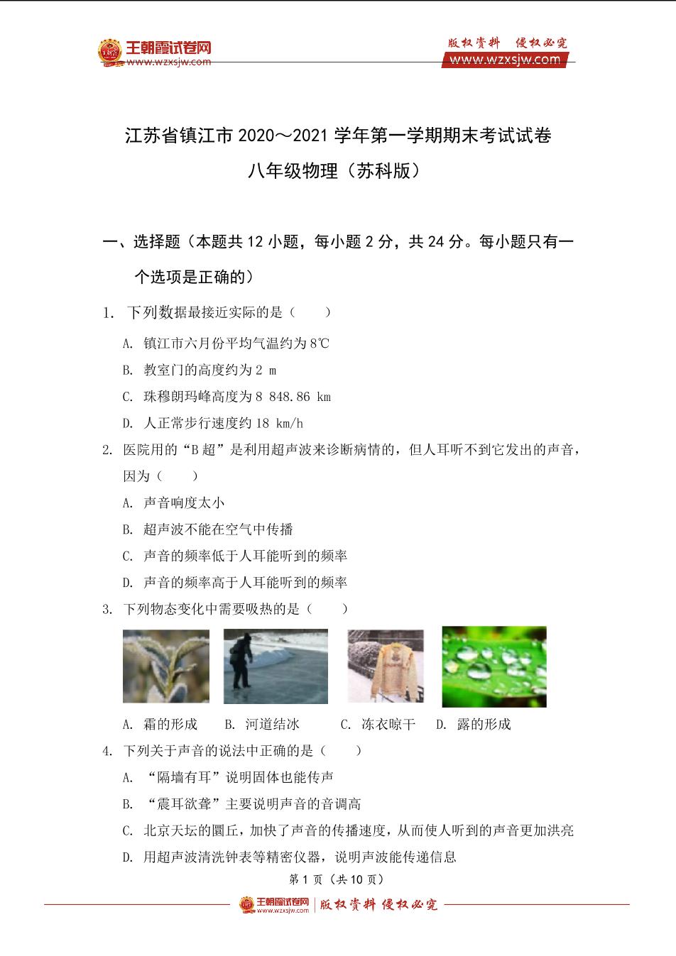 江苏省镇江市2020~2021学年第一学期期末考试试卷八年级物理(苏科版)