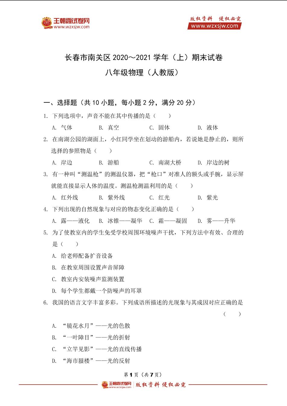 长春市南关区2020~2021学年(上)期末试卷八年级物理(人教版)