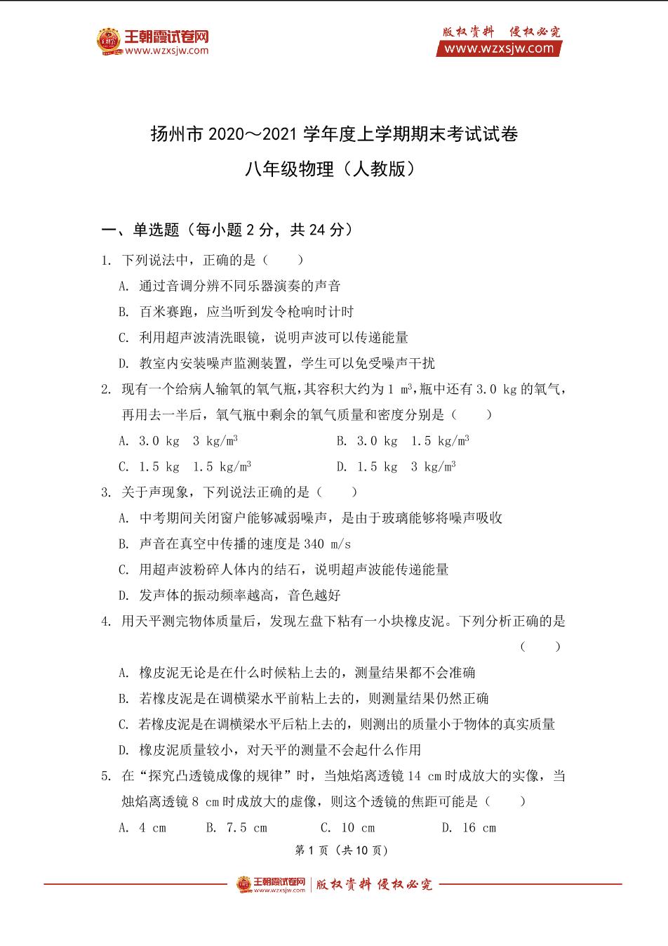扬州市2020~2021学年度上学期期末考试试卷八年级物理(人教版)