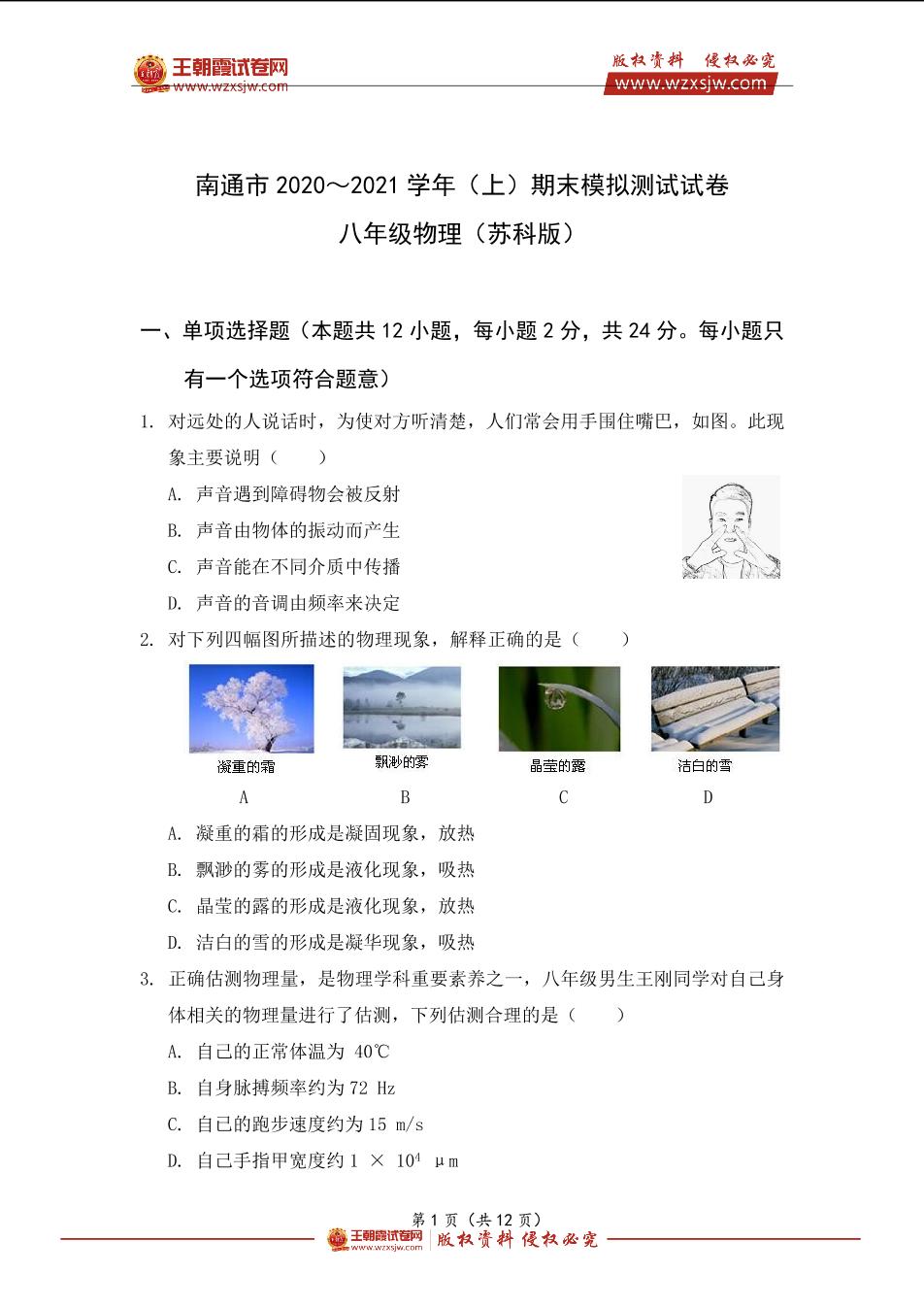 南通市2020~2021学年(上)期末模拟测试试卷八年级物理(苏科版)
