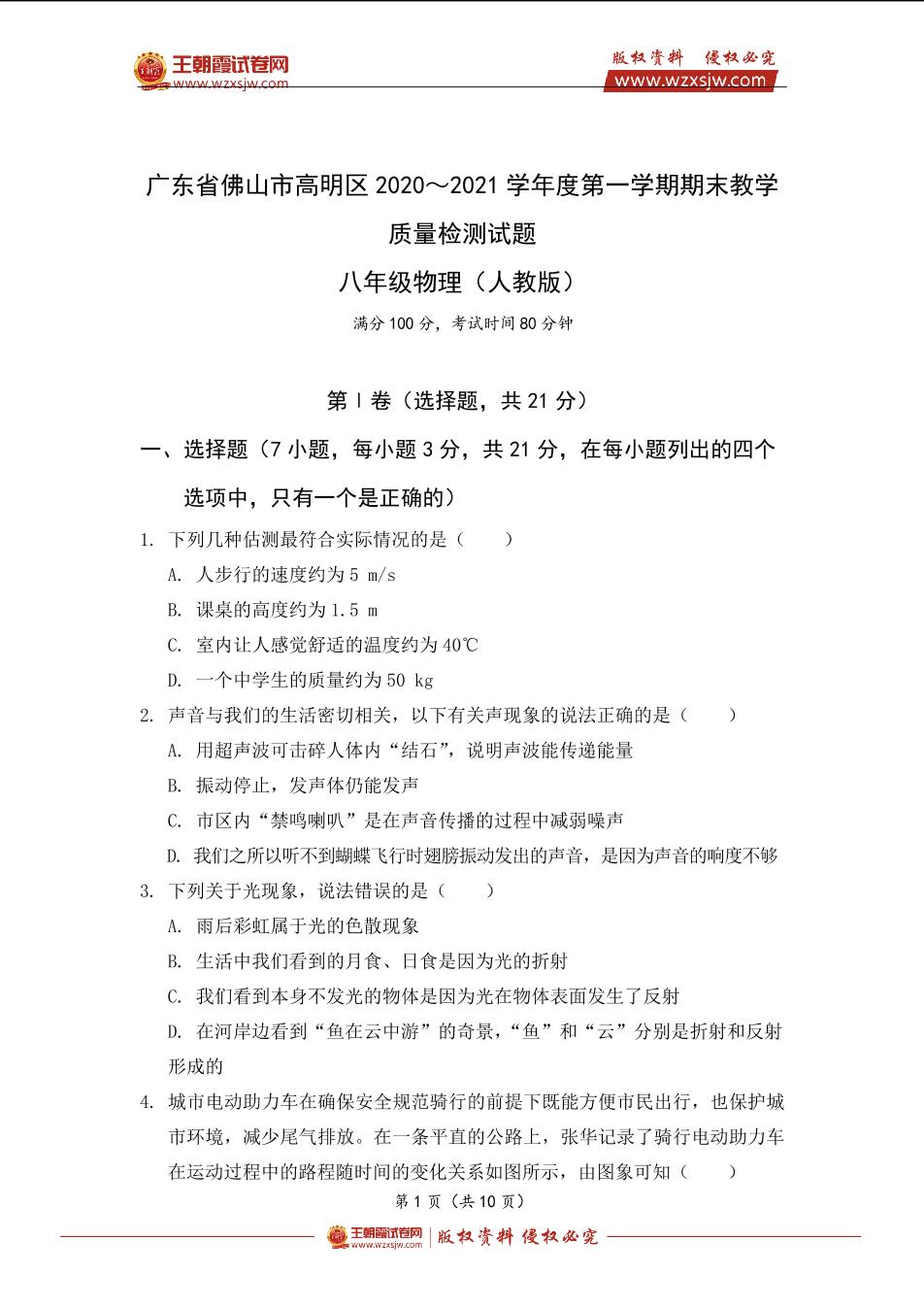 广东省佛山市高明区2020~2021学年度第一学期期末教学质量检测试题八年级物理(人教版)