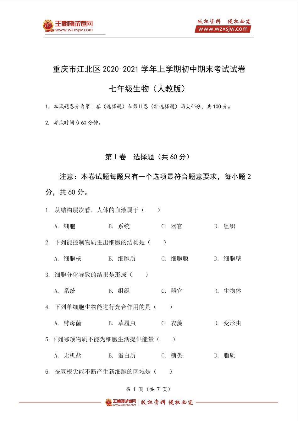 重庆市江北区2020-2021学年上学期初中七年级期末考试生物试卷(人教版)_R211203153040492