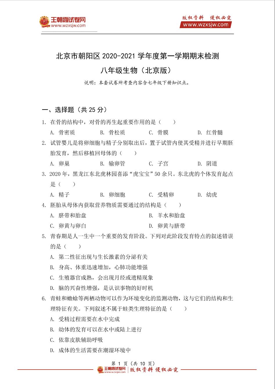 北京市朝阳区2020-2021学年上学期初中八年级期末考试生物试卷(北京版)_R211203153041062