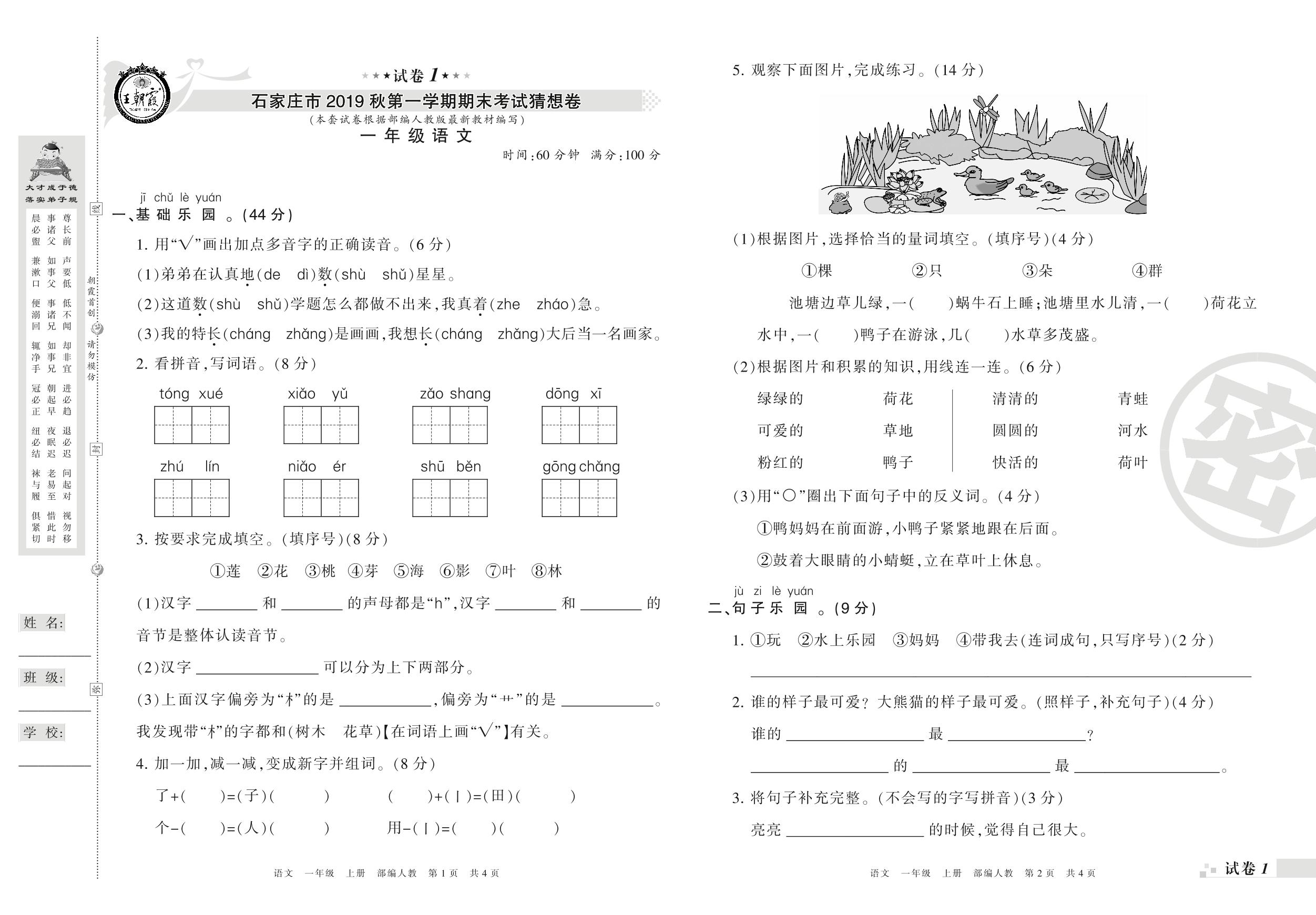 2018-2019学年第一学期石家庄市一年级语文试卷(人教版)【1】