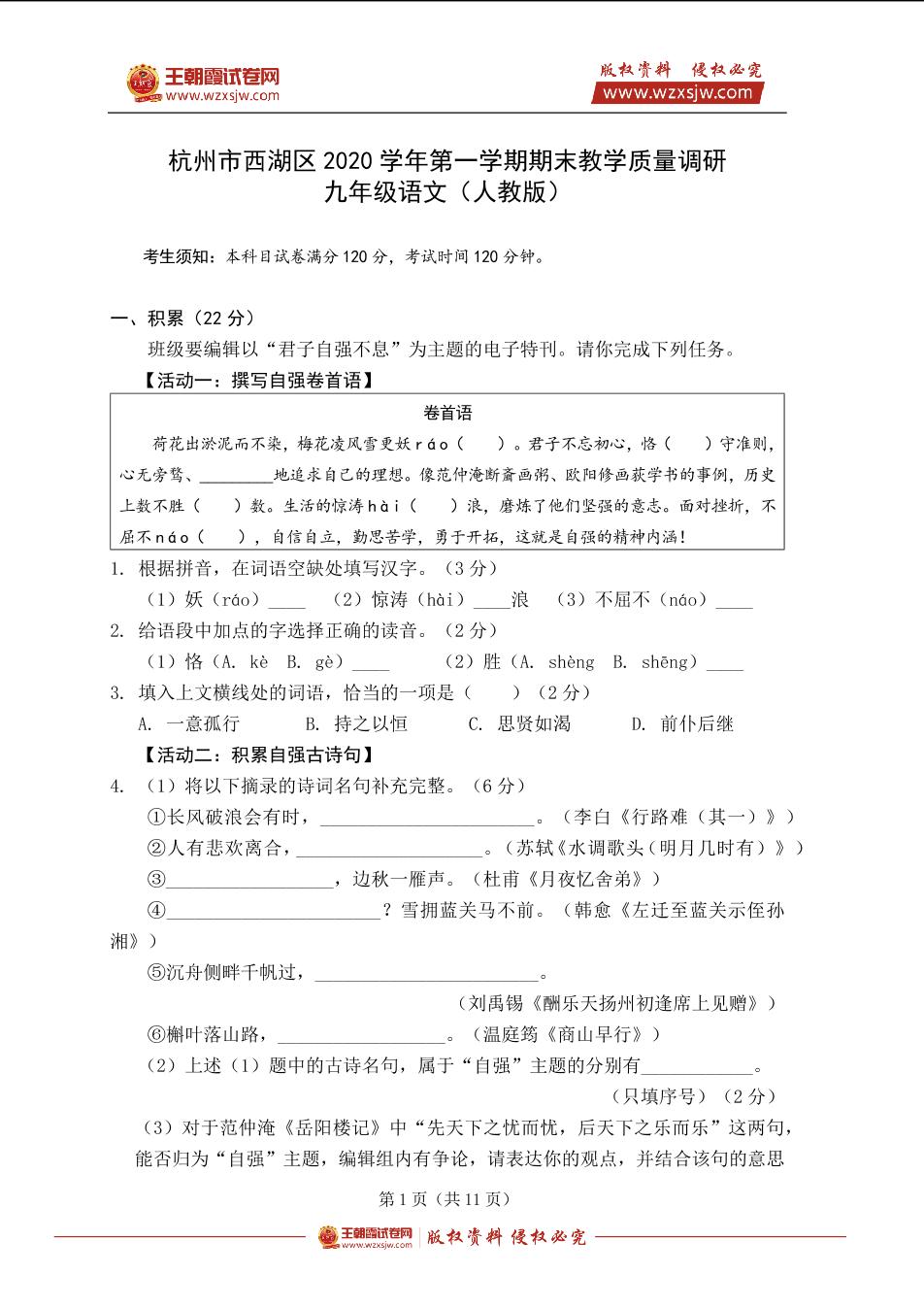 杭州市西湖区2020~2021学年上学期九年级期末考试语文试题(人教版)