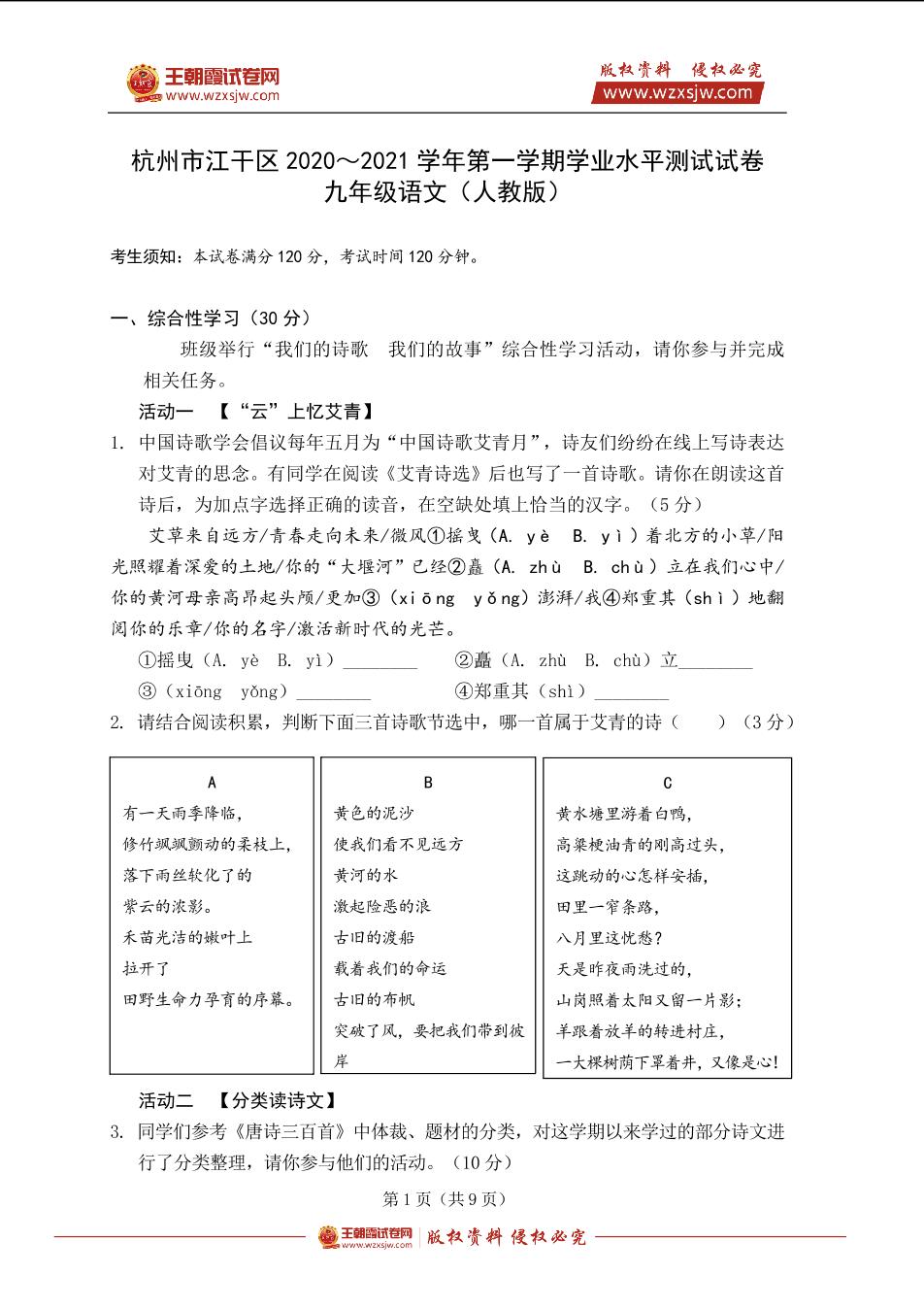杭州市江干区2020~2021学年九年级第一学期学业水平测试语文试卷(人教版)