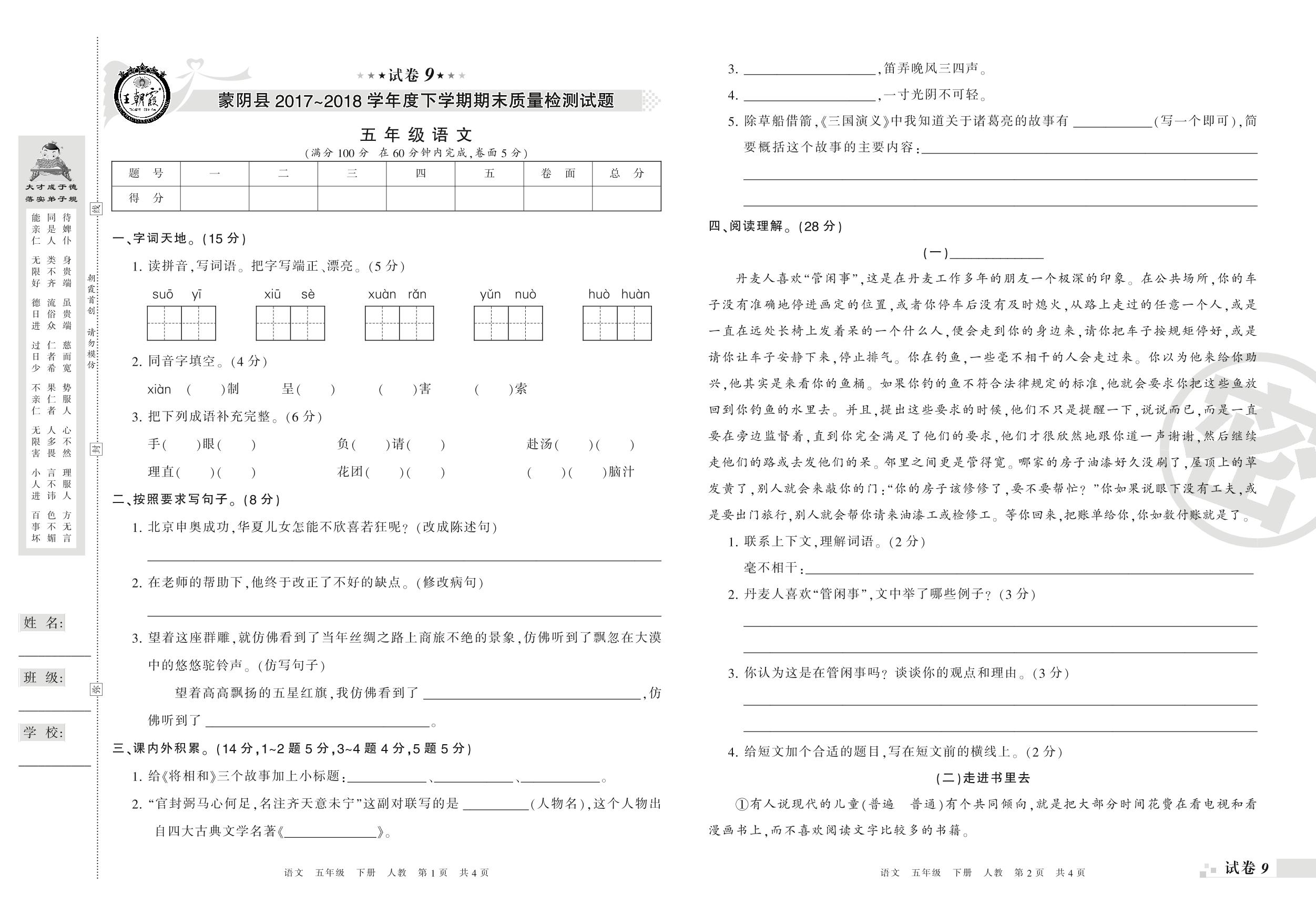 2017-2018学年第二学期临沂市蒙阴县五年级语文试卷(人教版)【9】