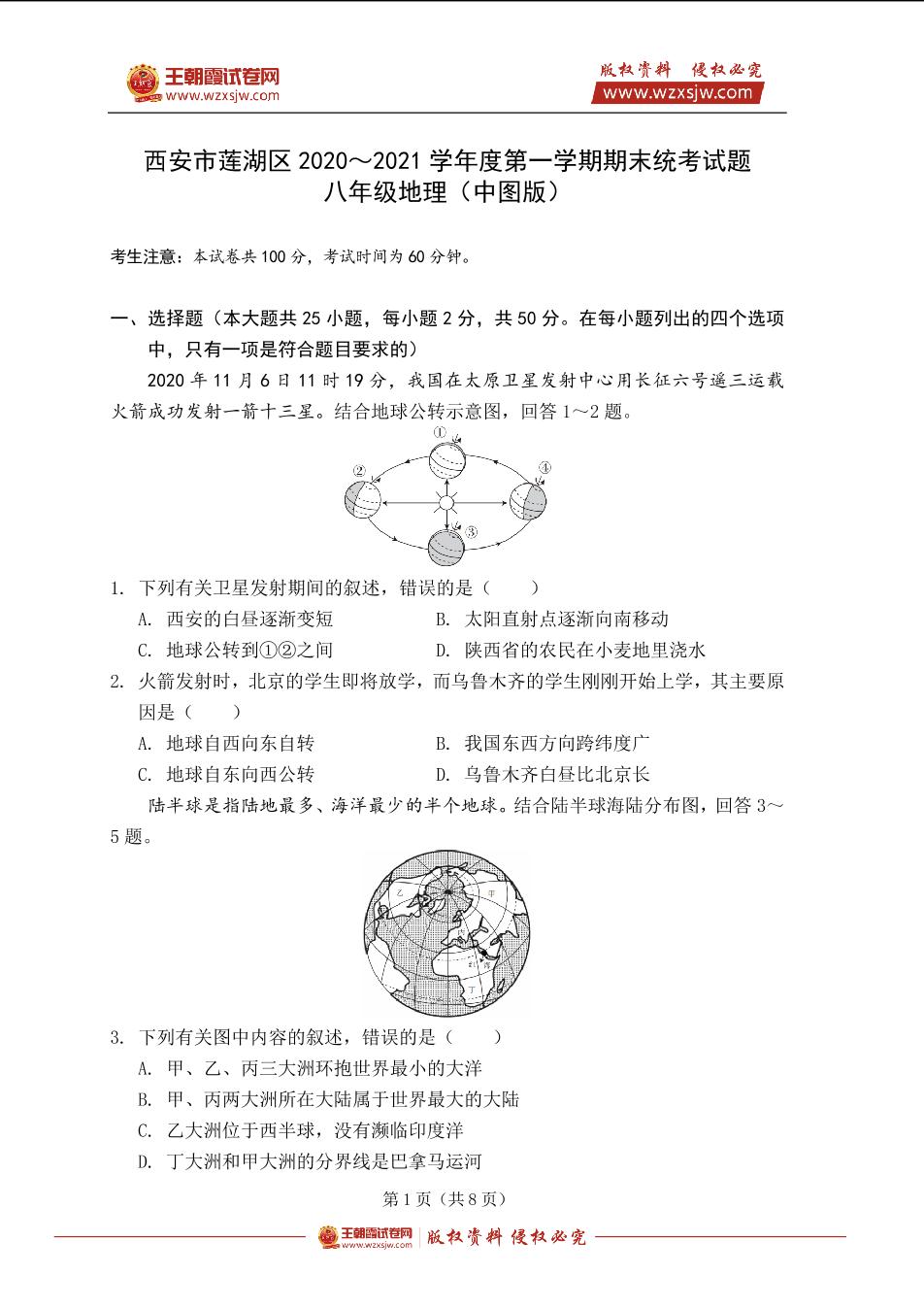 西安市莲湖区2020~2021学年度第一学期期末统考试题八年级地理(中图版)
