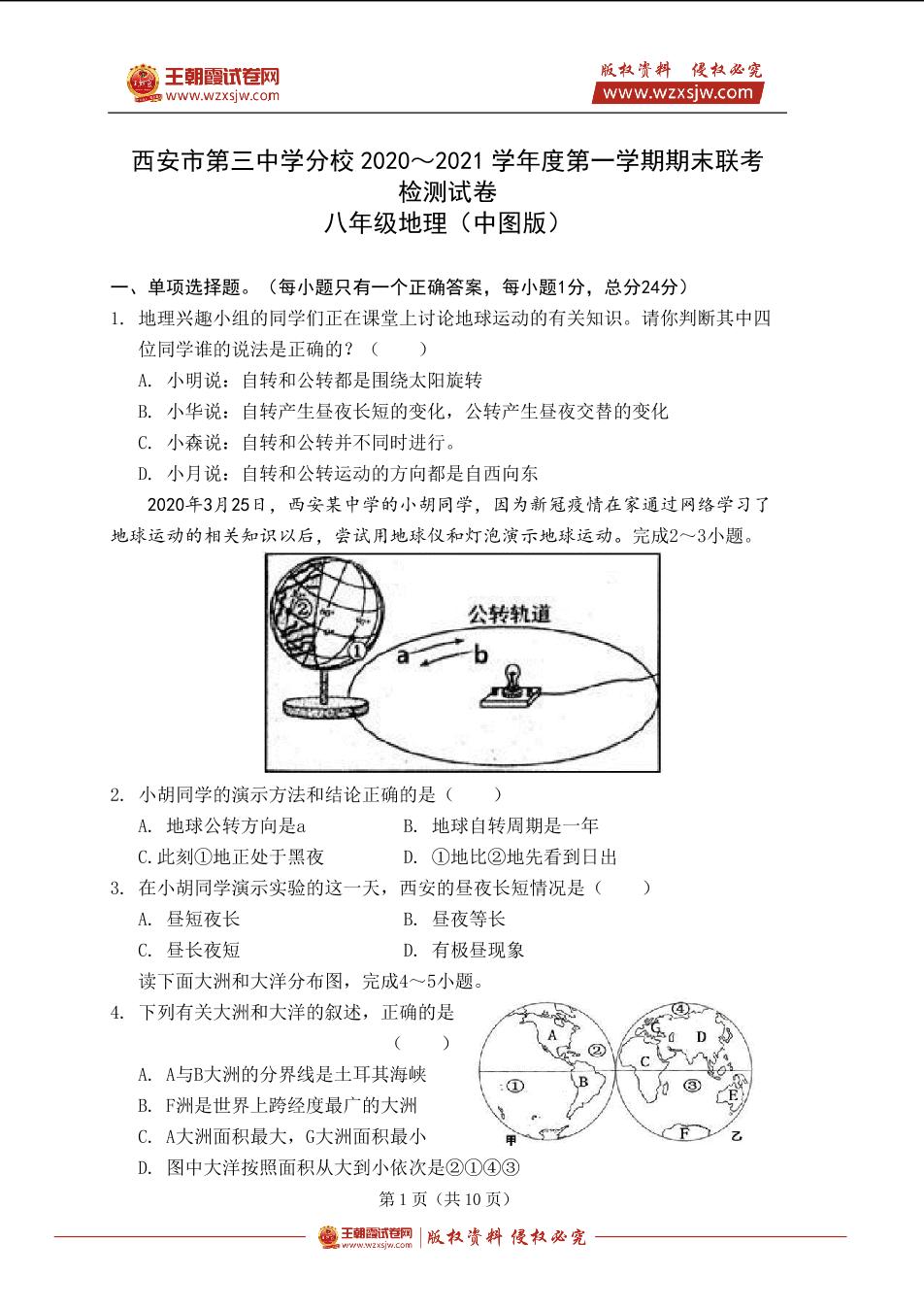 西安市第三中学分校2020~2021学年度八年级第一学期期末联考检测地理试卷(中图版)