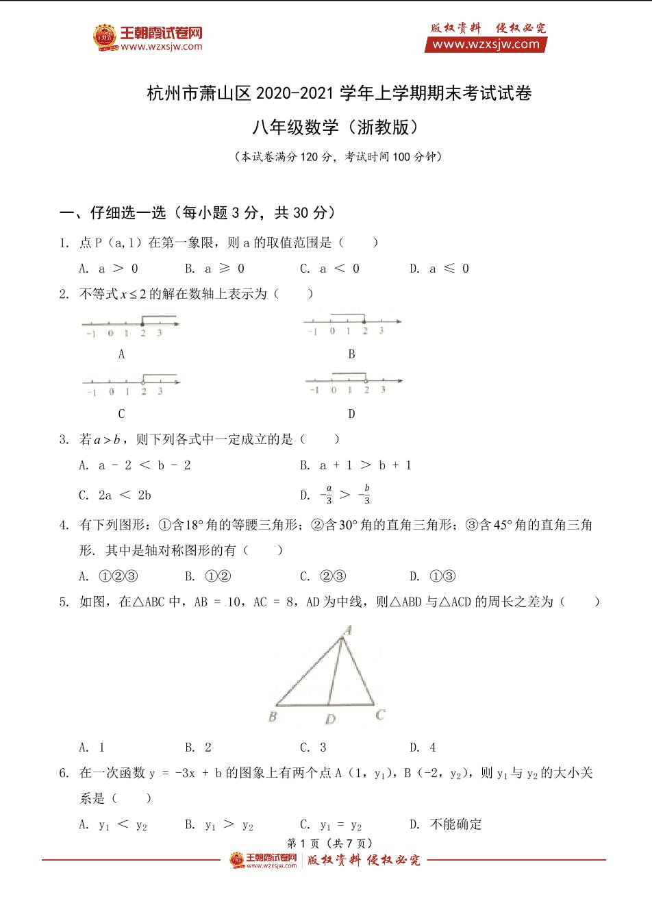 杭州市萧山区2020-2021学年上学期初中八年级期末考试数学试卷(浙教版)_R211203162519016