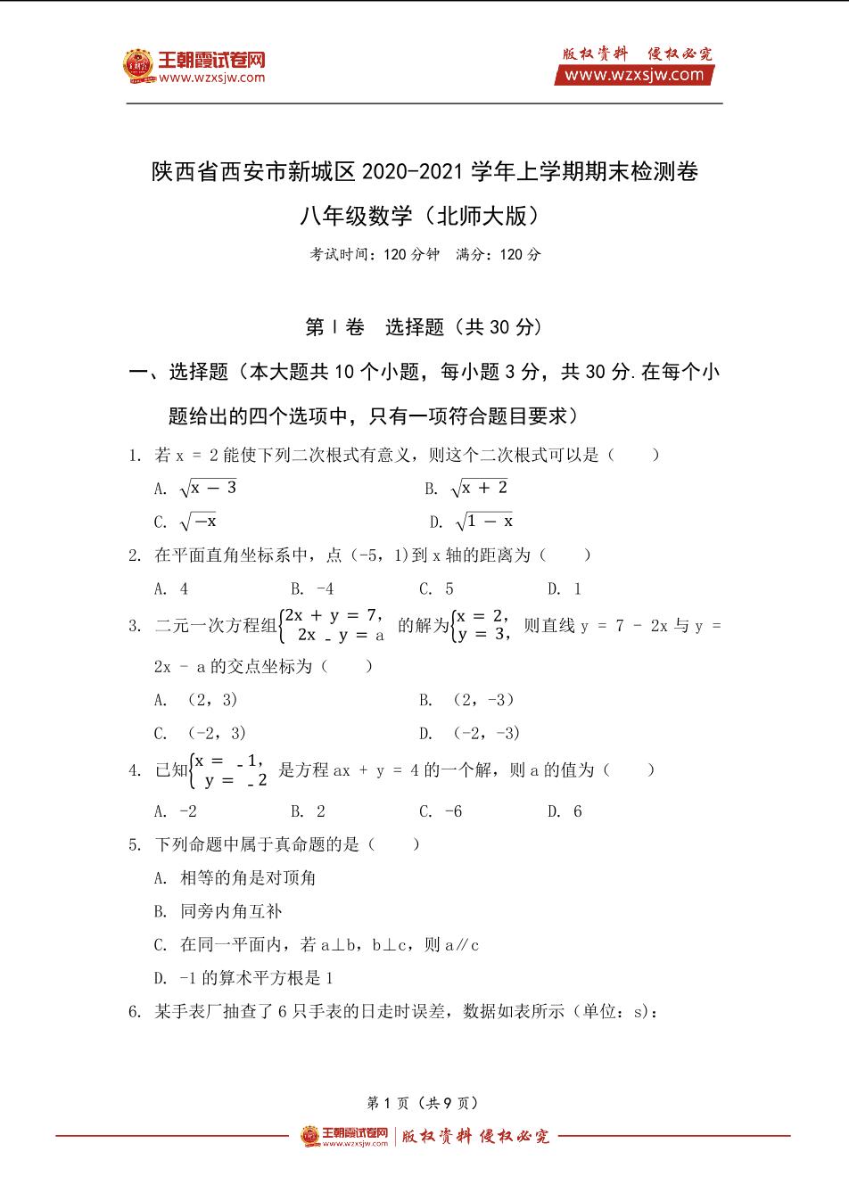 陕西省西安市新城区2020-2021学年上学期期末检测卷八年级数学(北师大版)_R211203162519323