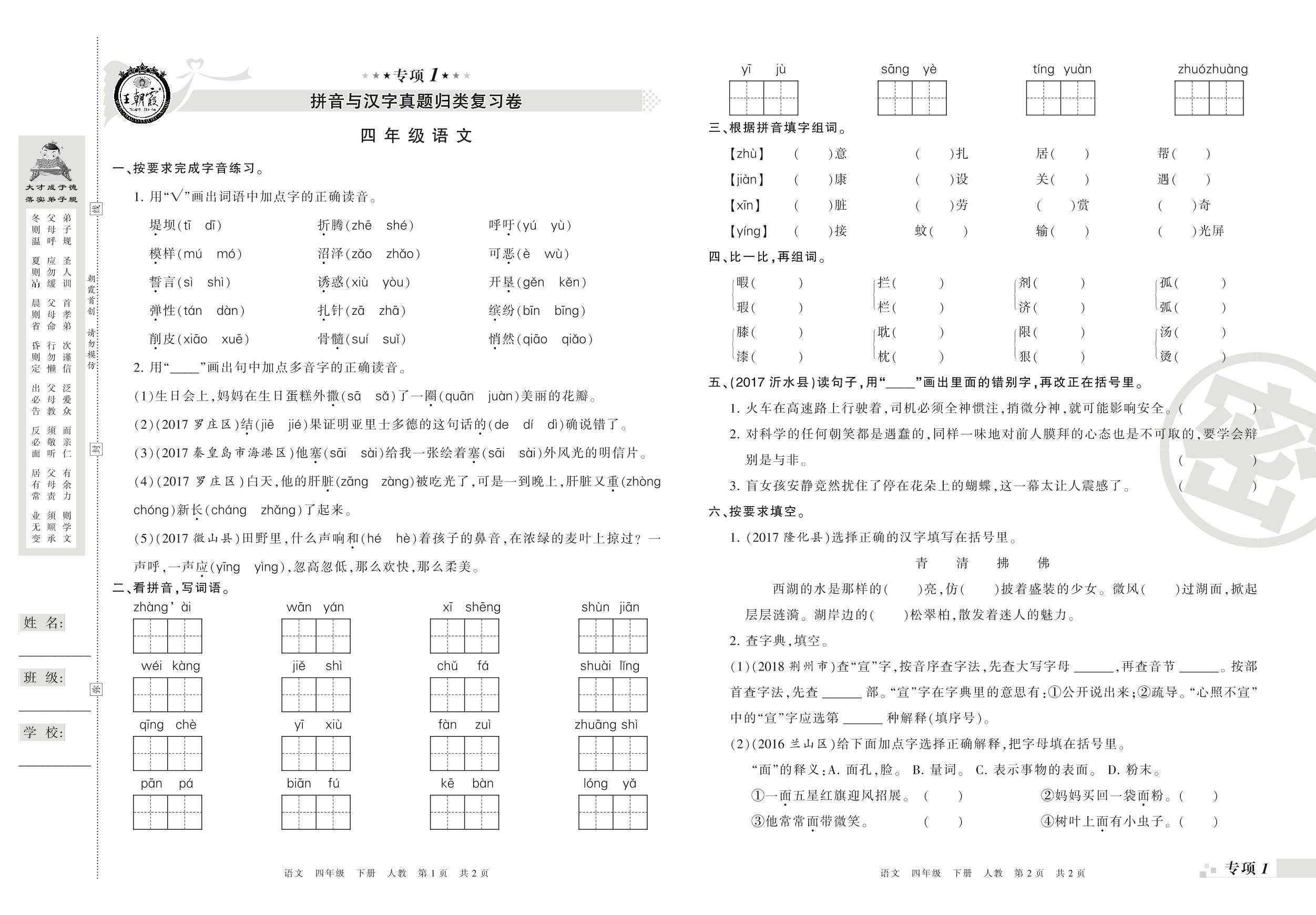 王朝霞期末专项卷——拼音与汉字、词语真题归类复习卷四年级下册语文(人教版)_R210801204943【0】