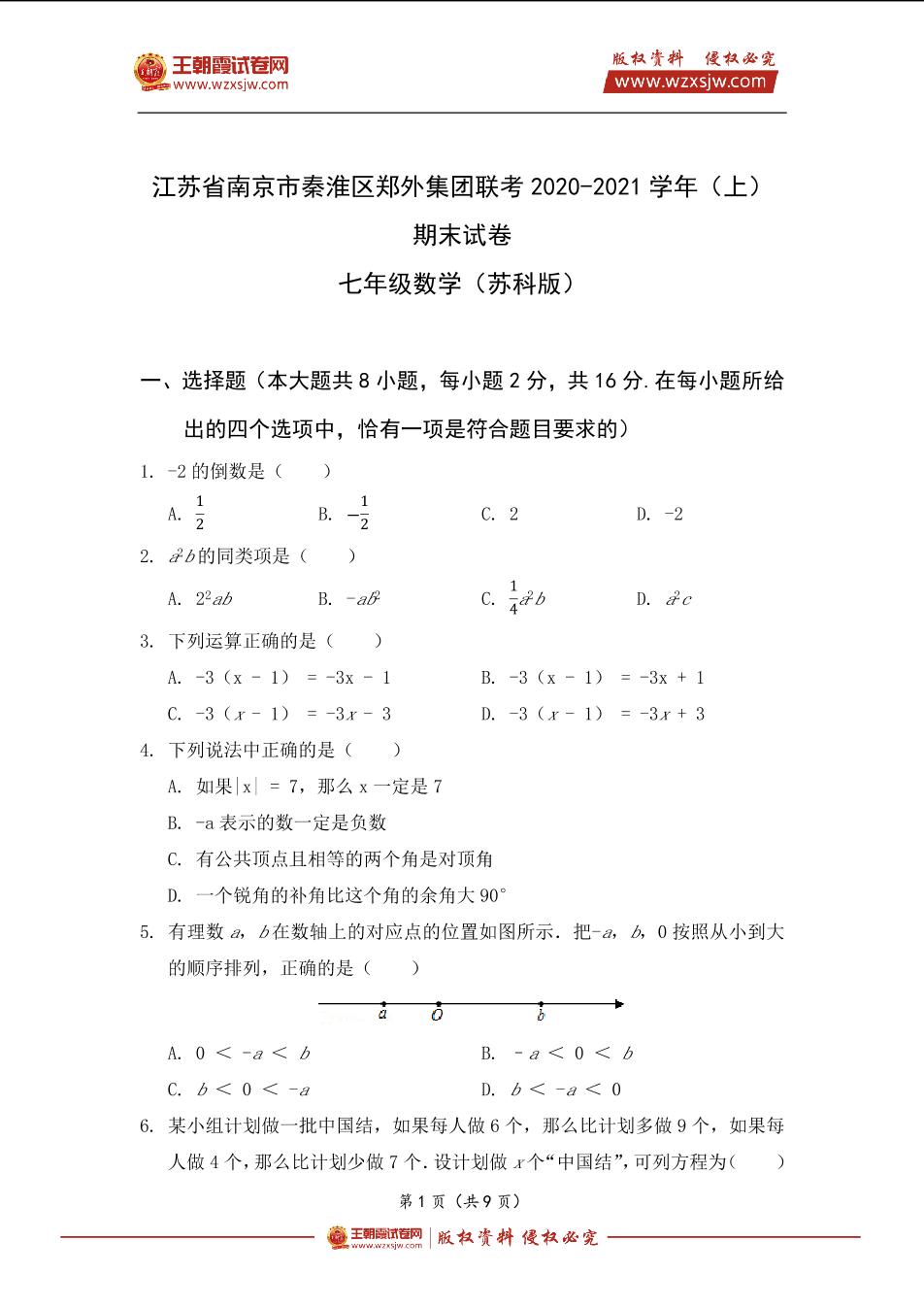江苏省南京市秦淮区2020-2021学年郑外集团联考七年级(上)期末数学试卷(苏科版)_R211203162521455