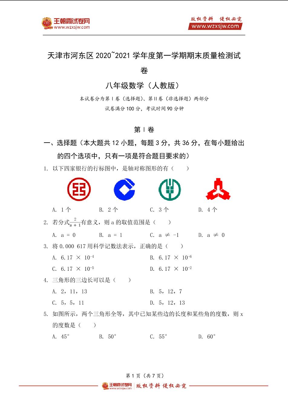 天津市河东区2020~2021学年度第一学期期末质量检测试卷八年级数学(人教版)_R211203162522314