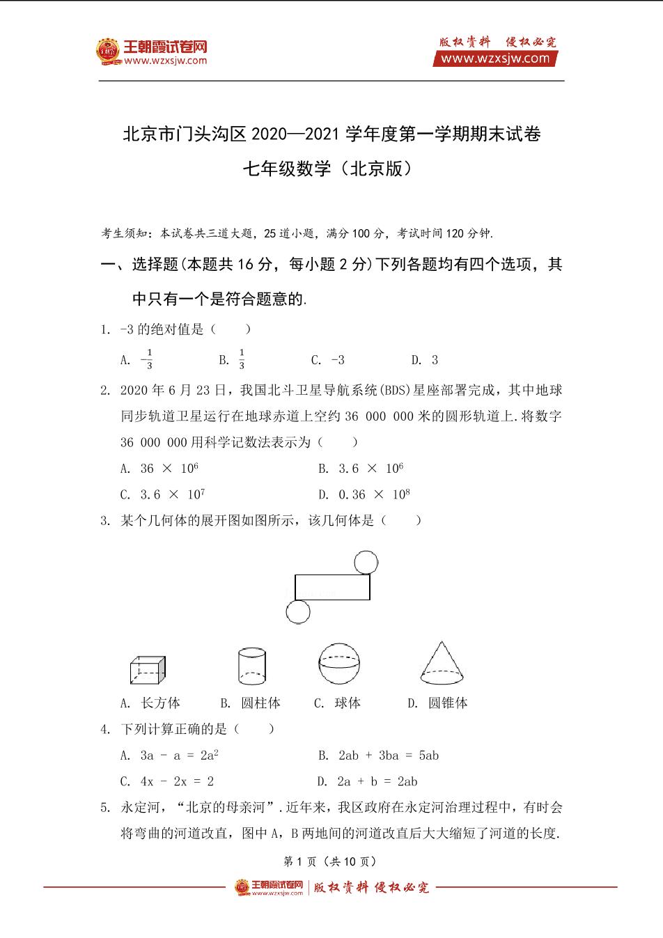 北京市门头沟区2020-2021学年度第一学期七年级数学期末试卷(北京版)_R211203162523195