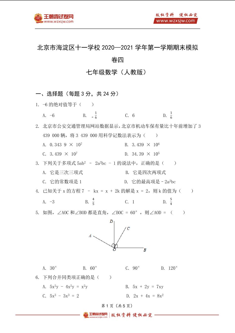 北京市海淀区十一学校2020-2021学年第一学期七年级上册数学期末模拟卷四(人教版)_R211203162523216