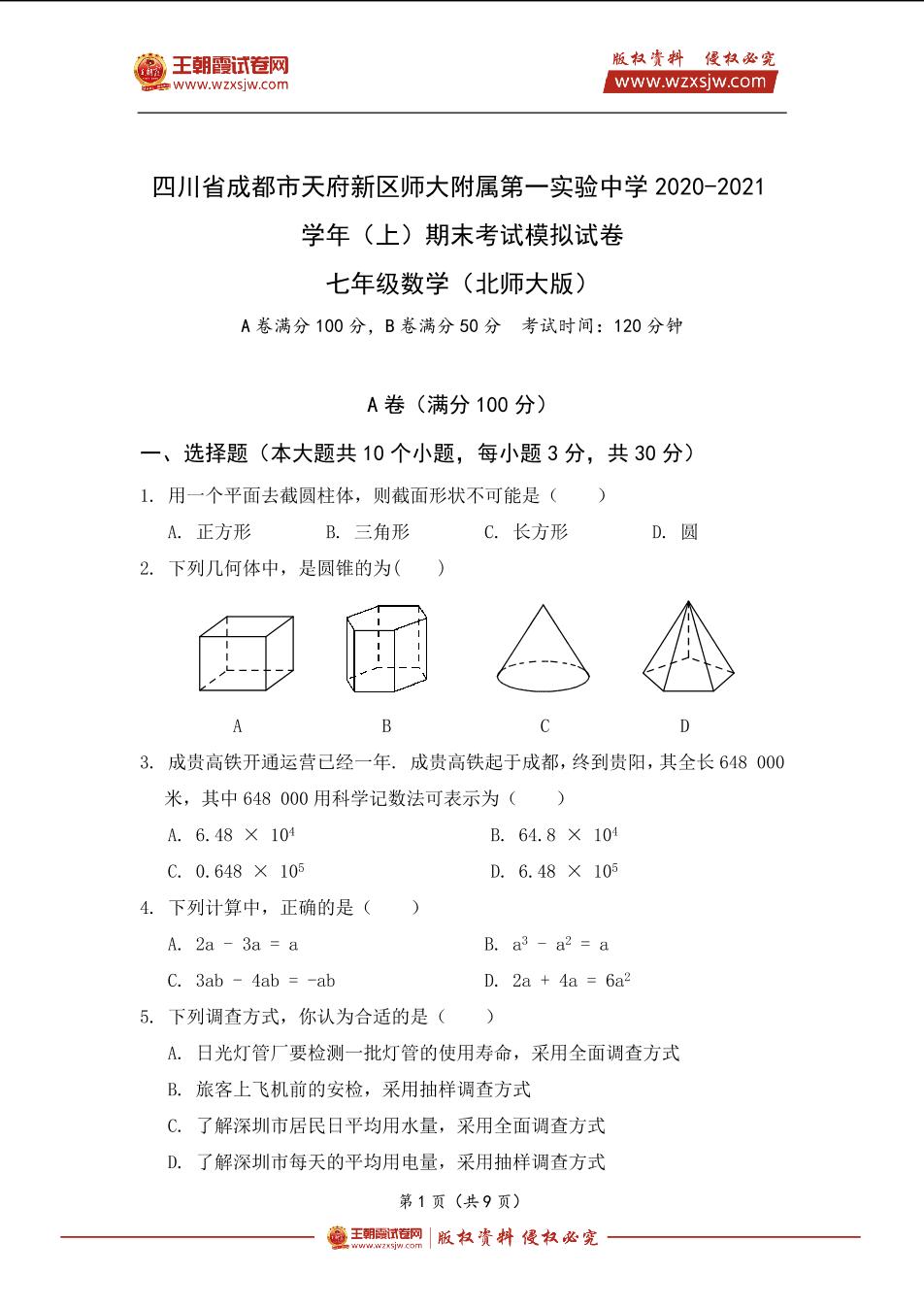 四川省成都市天府新区师大附属第一实验中学2020-2021学年(上)期末考试模拟试卷七年级数学(北师大版)_R211203162523980