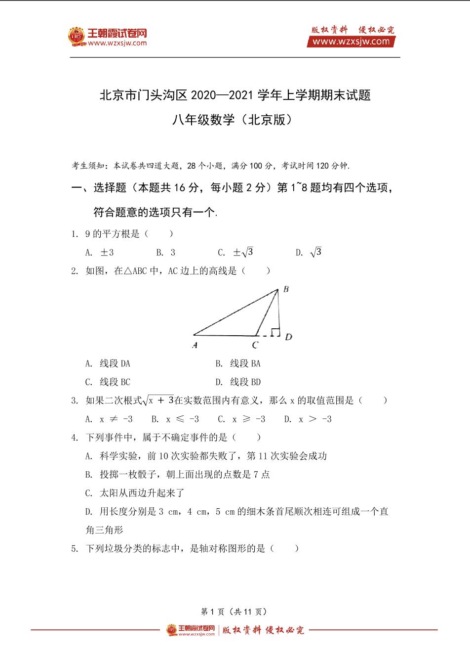 北京市门头沟区2020-2021学年八年级上学期期末考试数学试卷(北京版)