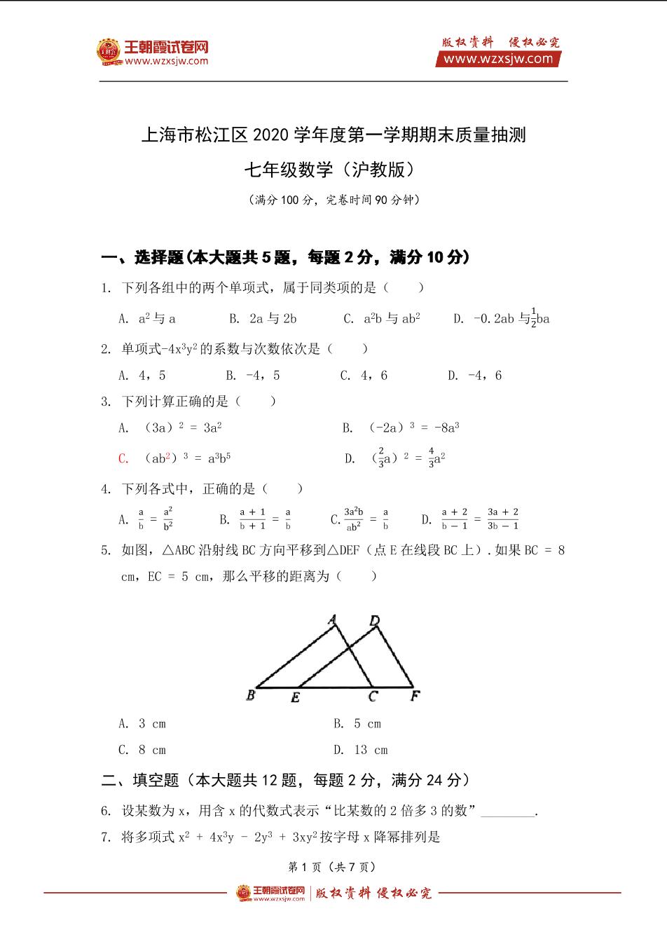 上海市松江区2020-2021学年上学期初中七年级期末考试数学试卷(沪教版)_R211203162524457
