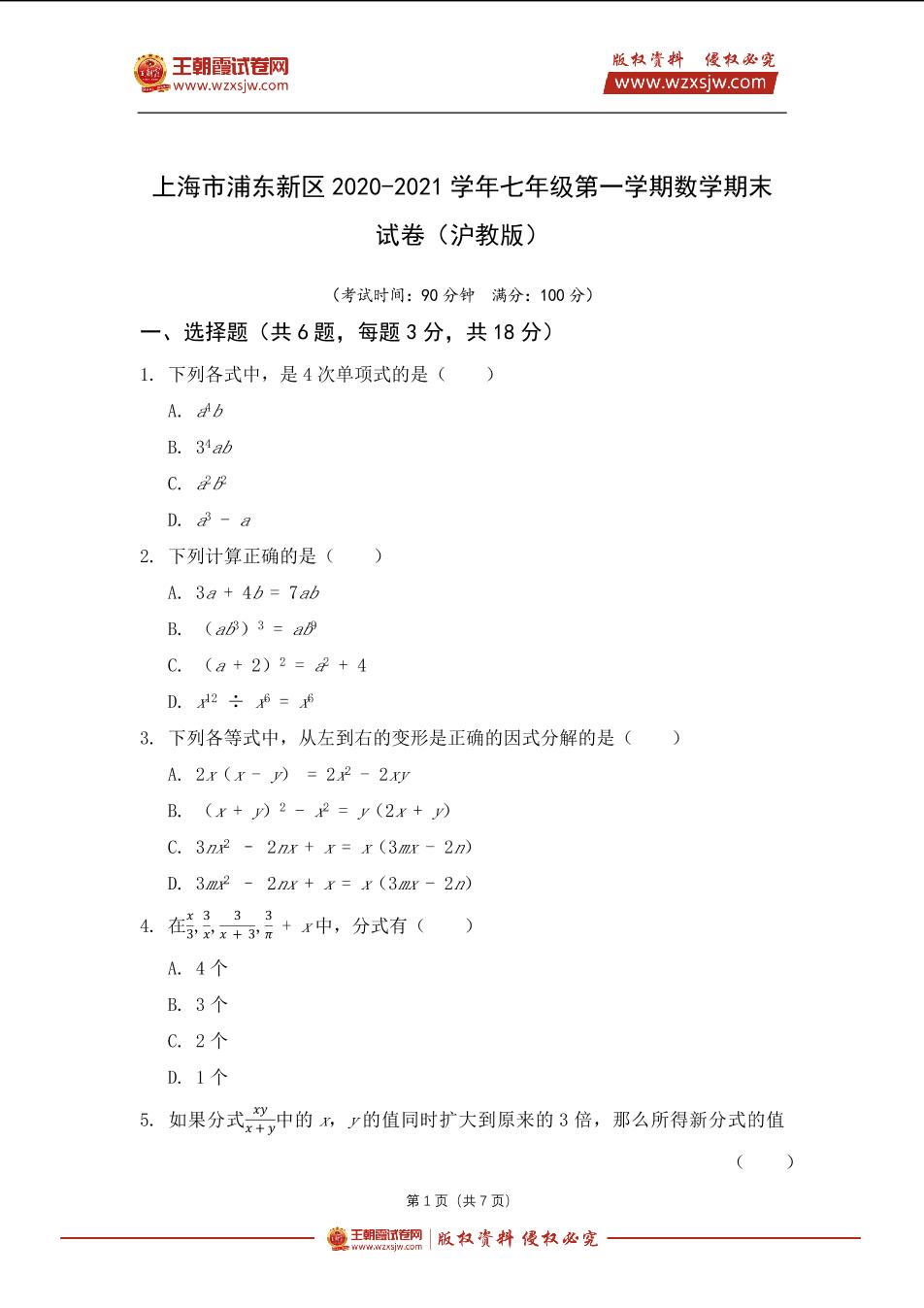 上海市浦东新区2020-2021学年七年级数学第一学期期末试卷(沪教版)_R211203162524618
