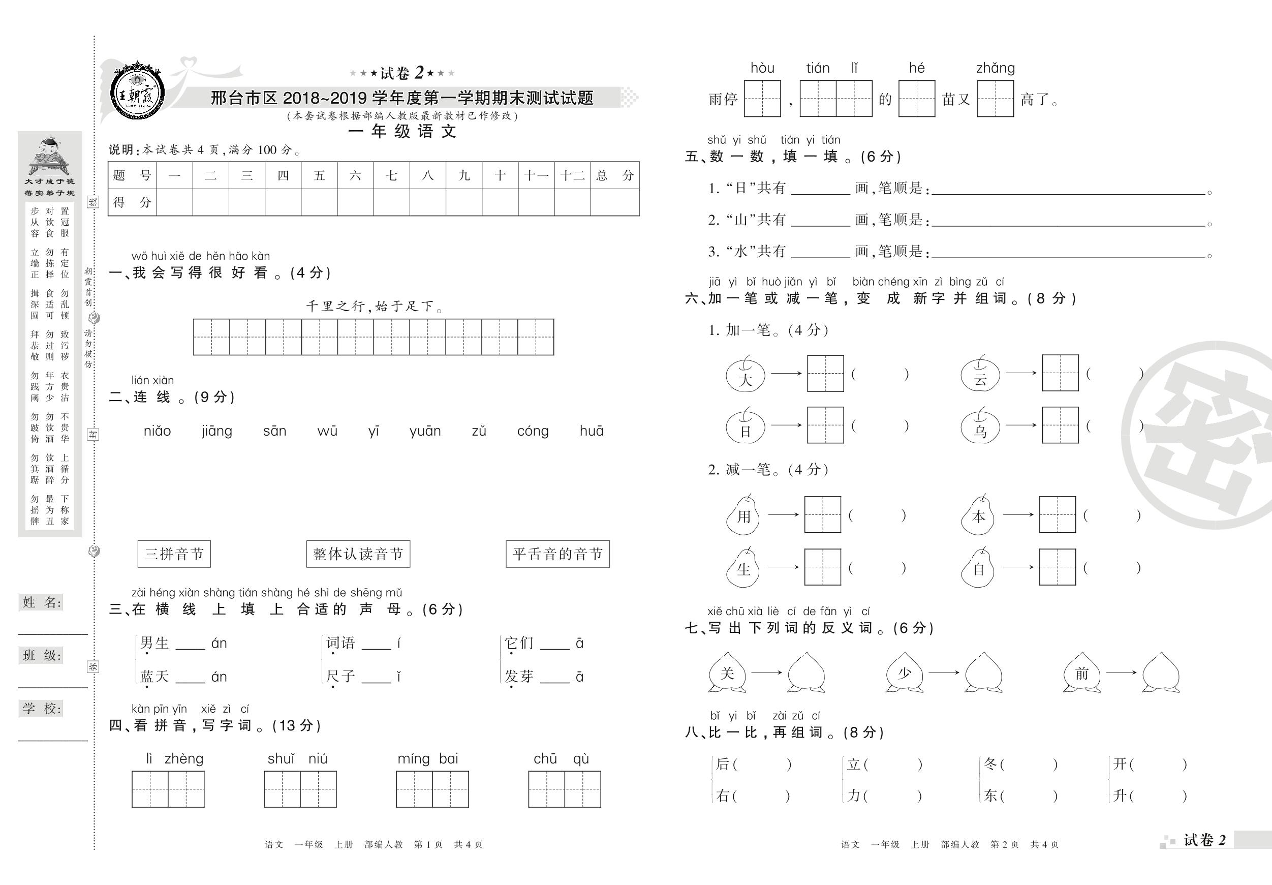 2018-2019学年第一学期邢台市区一年级语文试卷(人教版)【2】