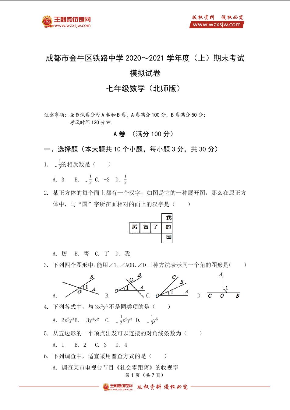 成都市金牛区铁路中学2020~2021学年度(上)期末考试模拟试卷七年级数学(北师版)_R211203162525352