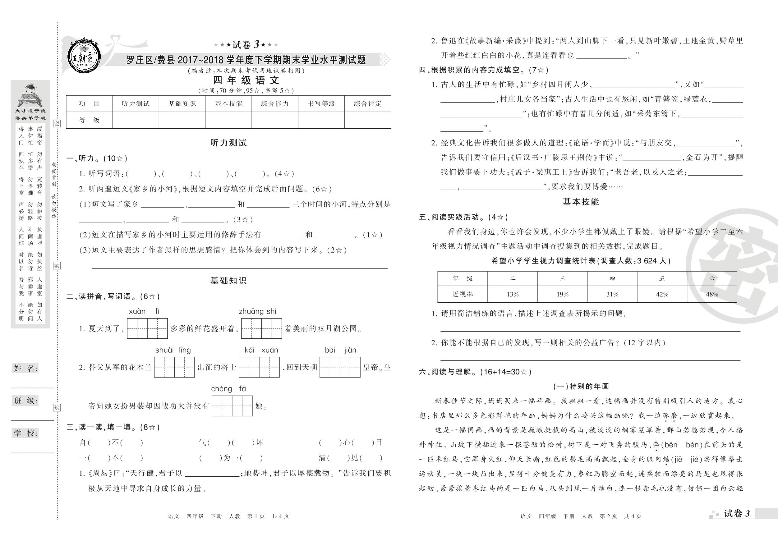 2017-2018学年第二学期临沂市罗庄区、费县四年级语文试卷(人教版)【3】