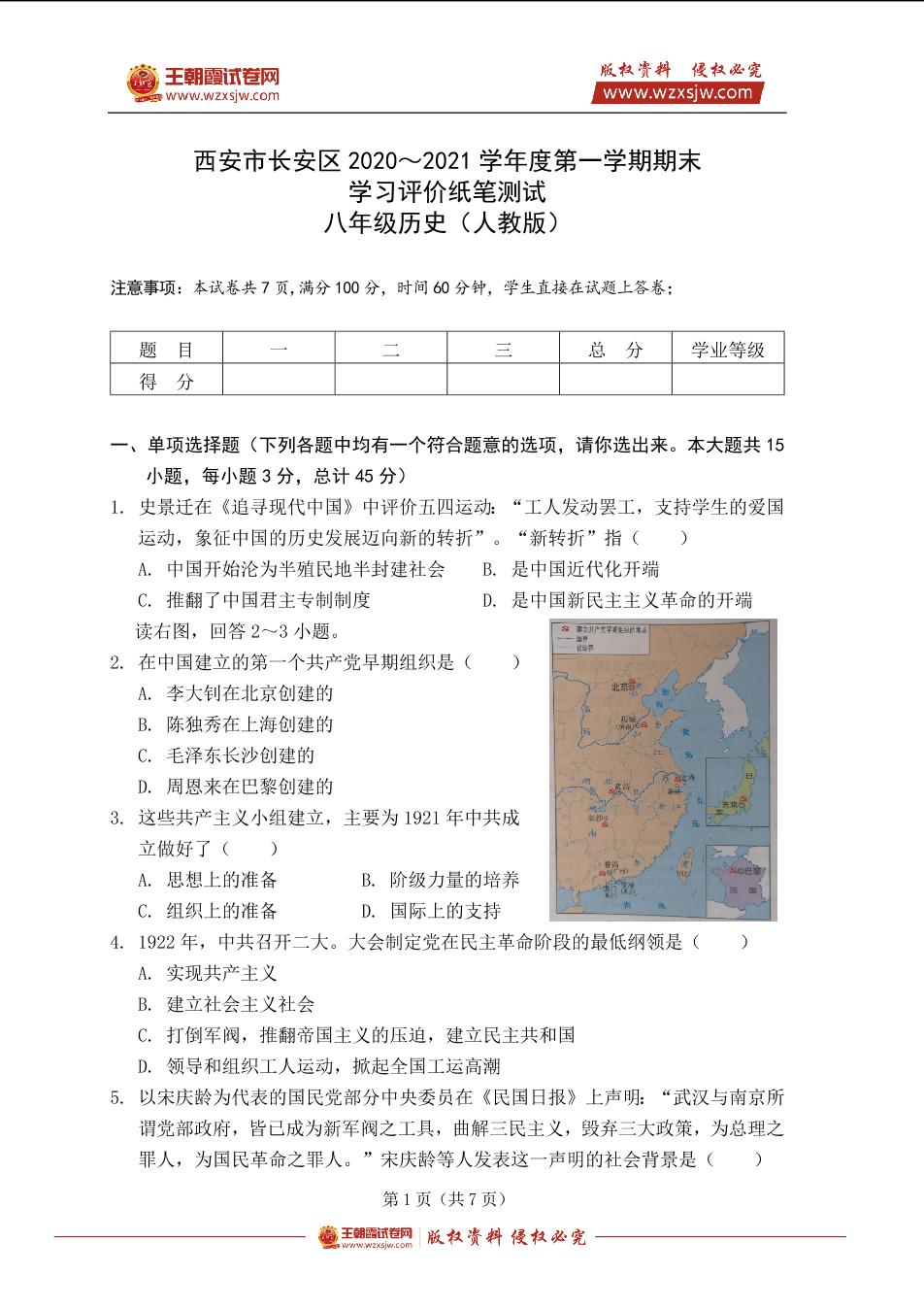 西安市长安区2020~2021学年度八年级第一学期期末历史学习评价纸笔测试(人教版)
