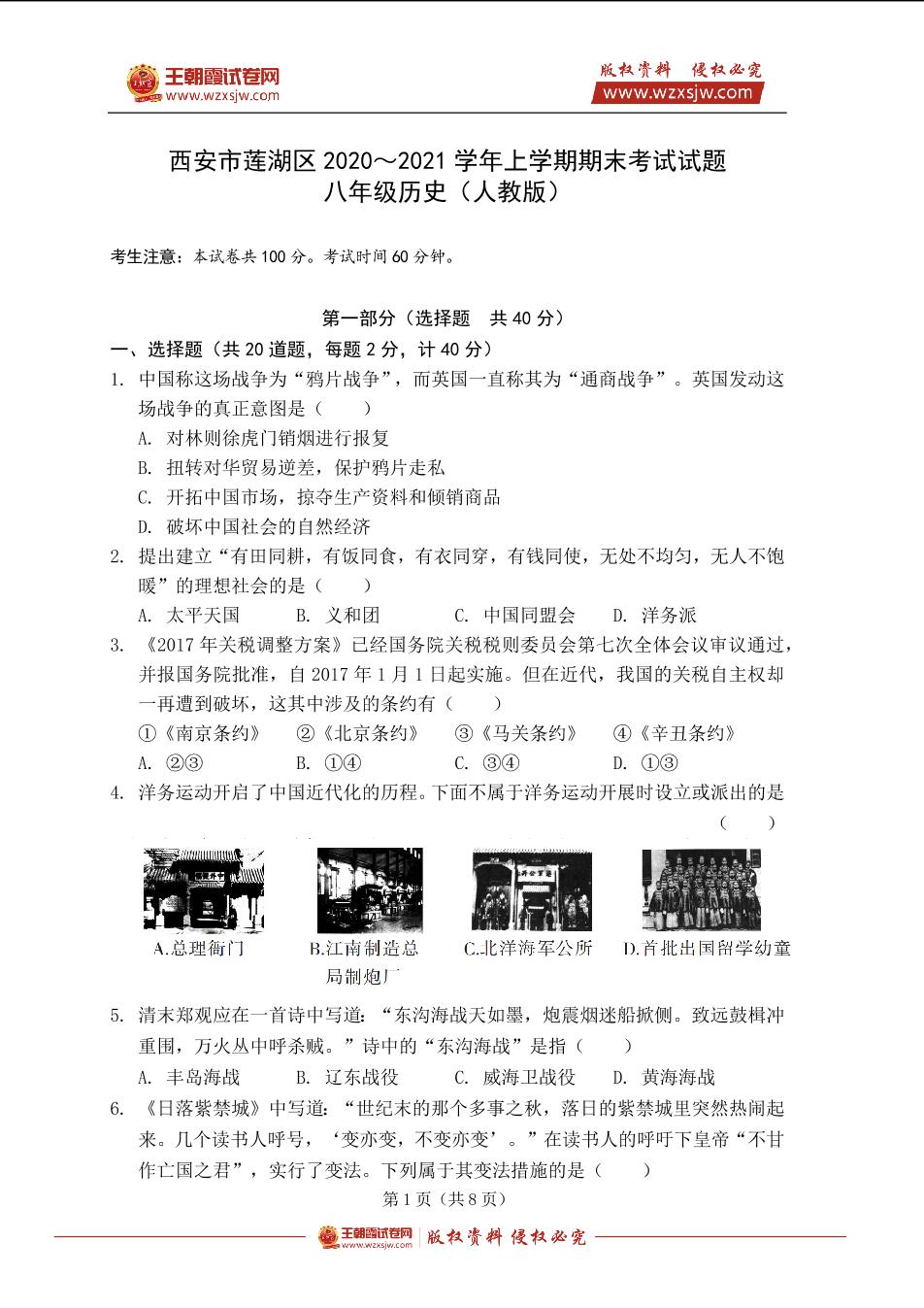 西安市莲湖区2020~2021学年八年级上学期期末考试历史试题(人教版)