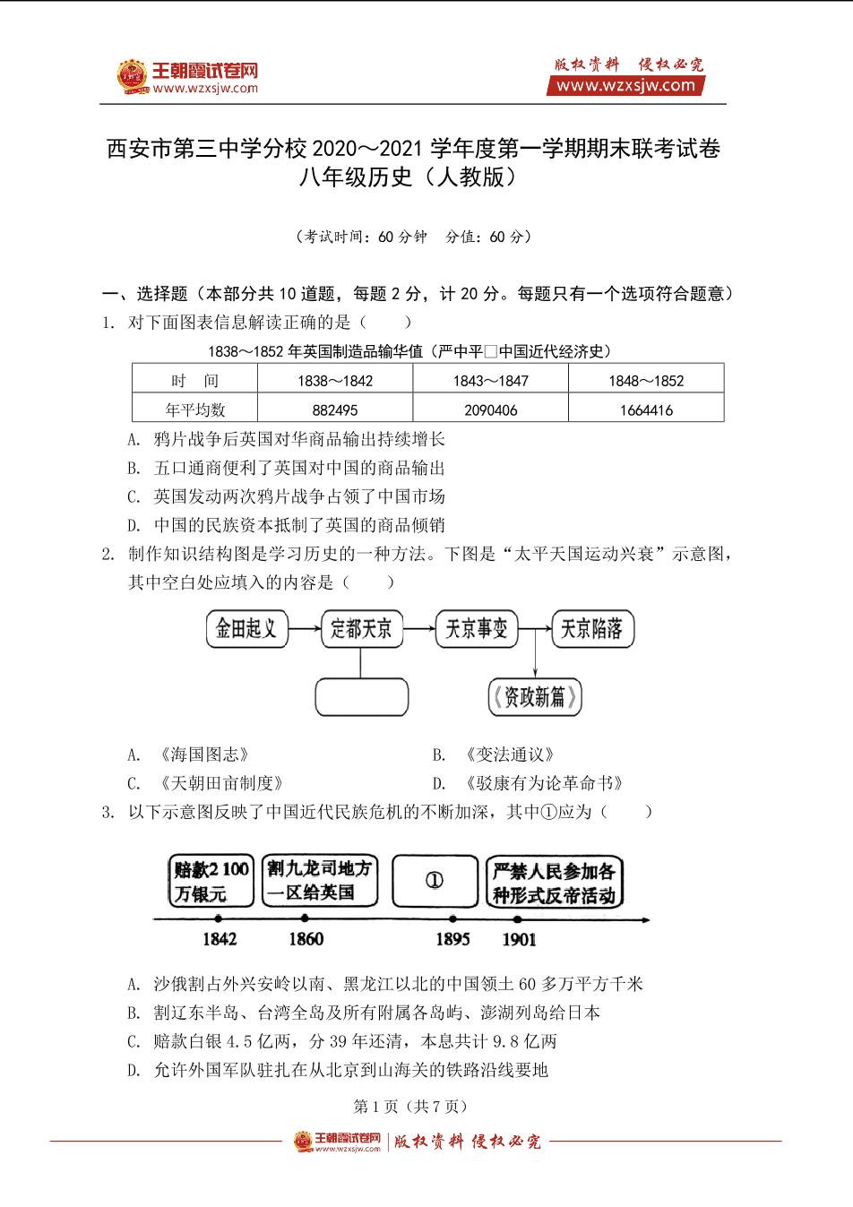 西安市第三中学分校2020~2021学年度第一学期期末联考试卷八年级历史(人教版)